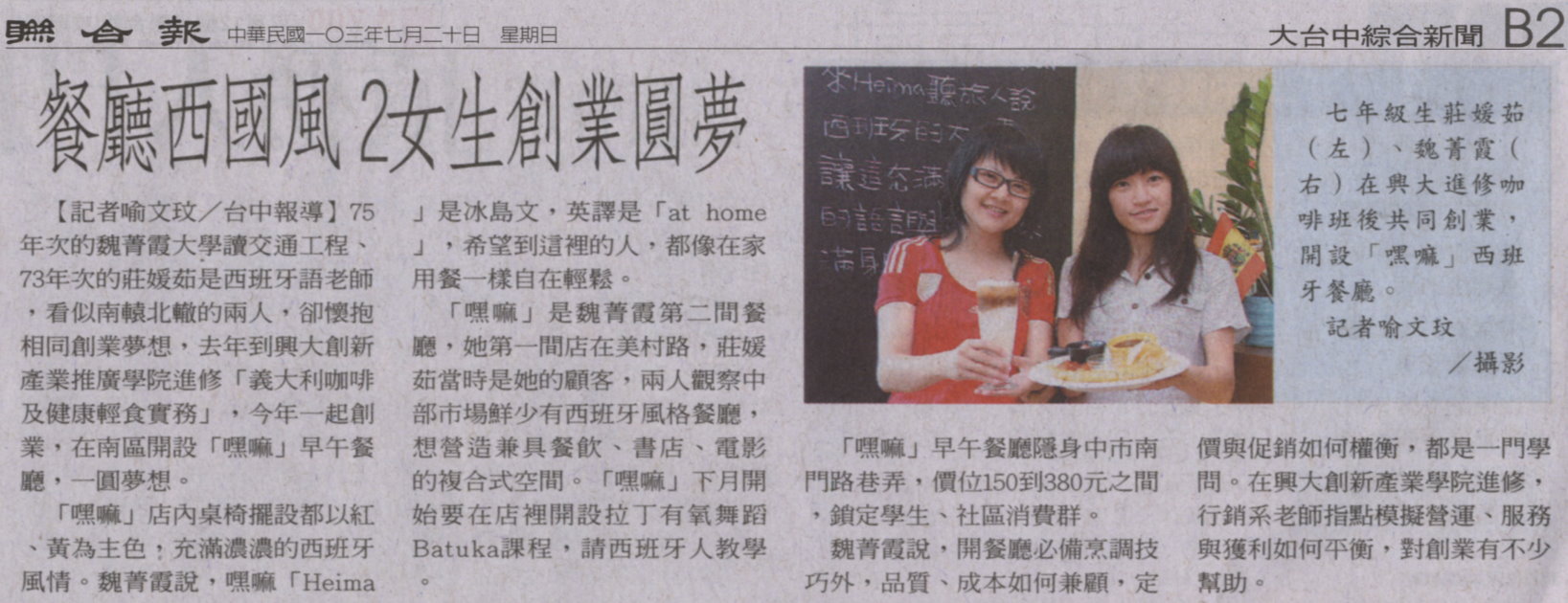 【媒體報導】餐廳西國風 2女生創業圓夢