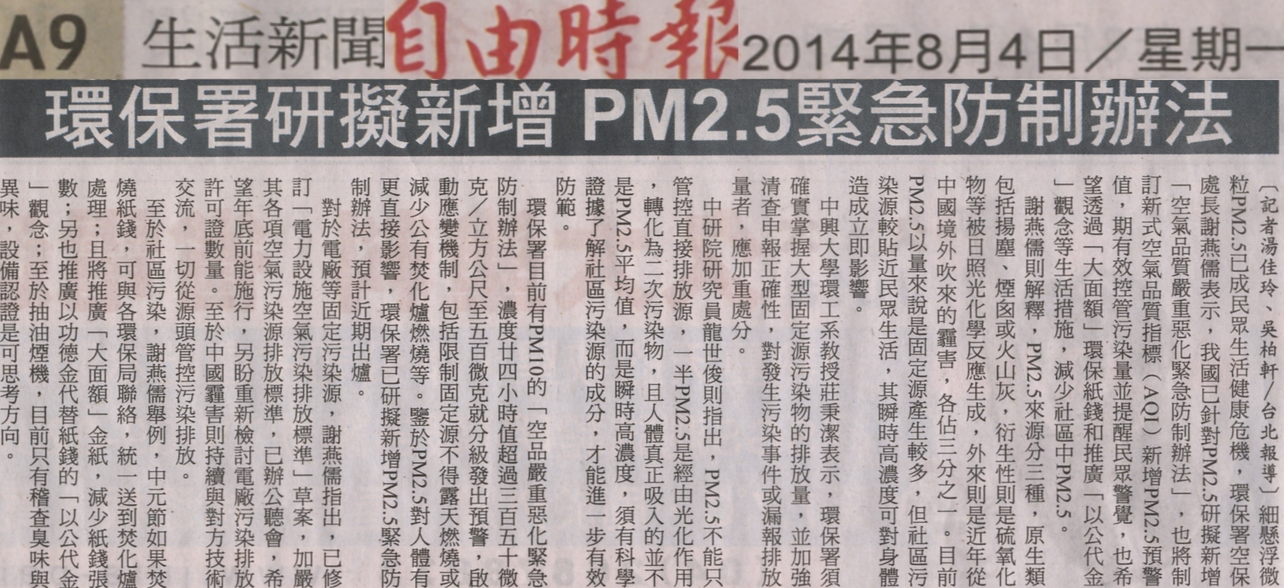 細懸浮微粒PM2.5已成民眾生活健康危機,環保署空保處長謝燕儒表示,我國已針對PM2.5研擬新增「空氣品質嚴重惡化緊急防制辦法」,也將制訂新式空氣品質指標(AQI)新增PM2.5預警值,期有效控管污染量並提醒民眾警覺,也希望透過「大面額」環保紙錢和推廣「以公代金」觀念等生活措施,減少社區中PM2.5。