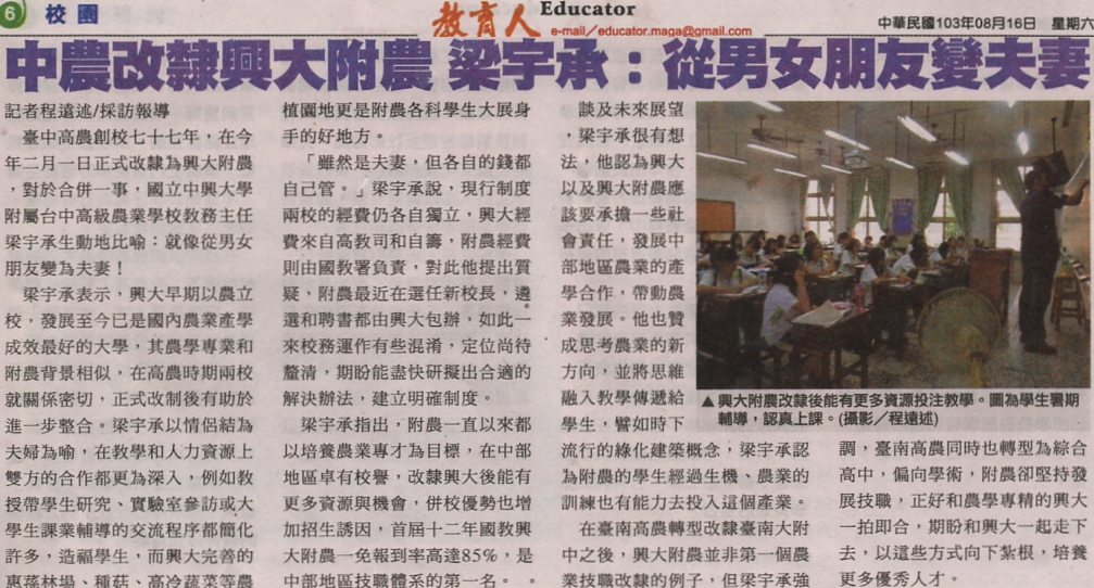 【媒體報導】中農改隸興大附農 梁宇承:從男女朋友變夫妻