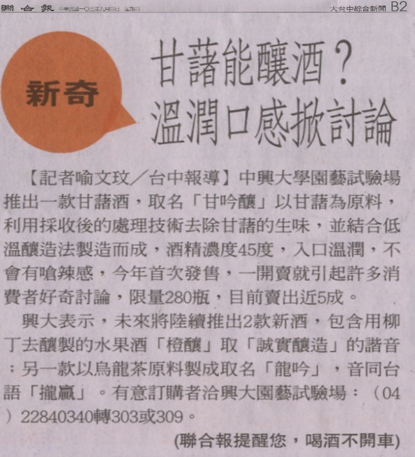 【媒體報導】新奇 甘藷能釀酒? 溫潤口感掀討論