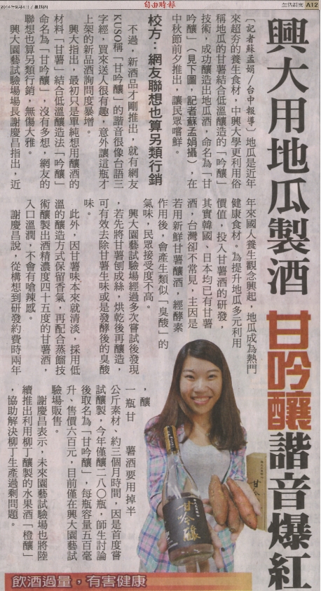 興大用地瓜製酒 「甘吟釀」諧音爆紅