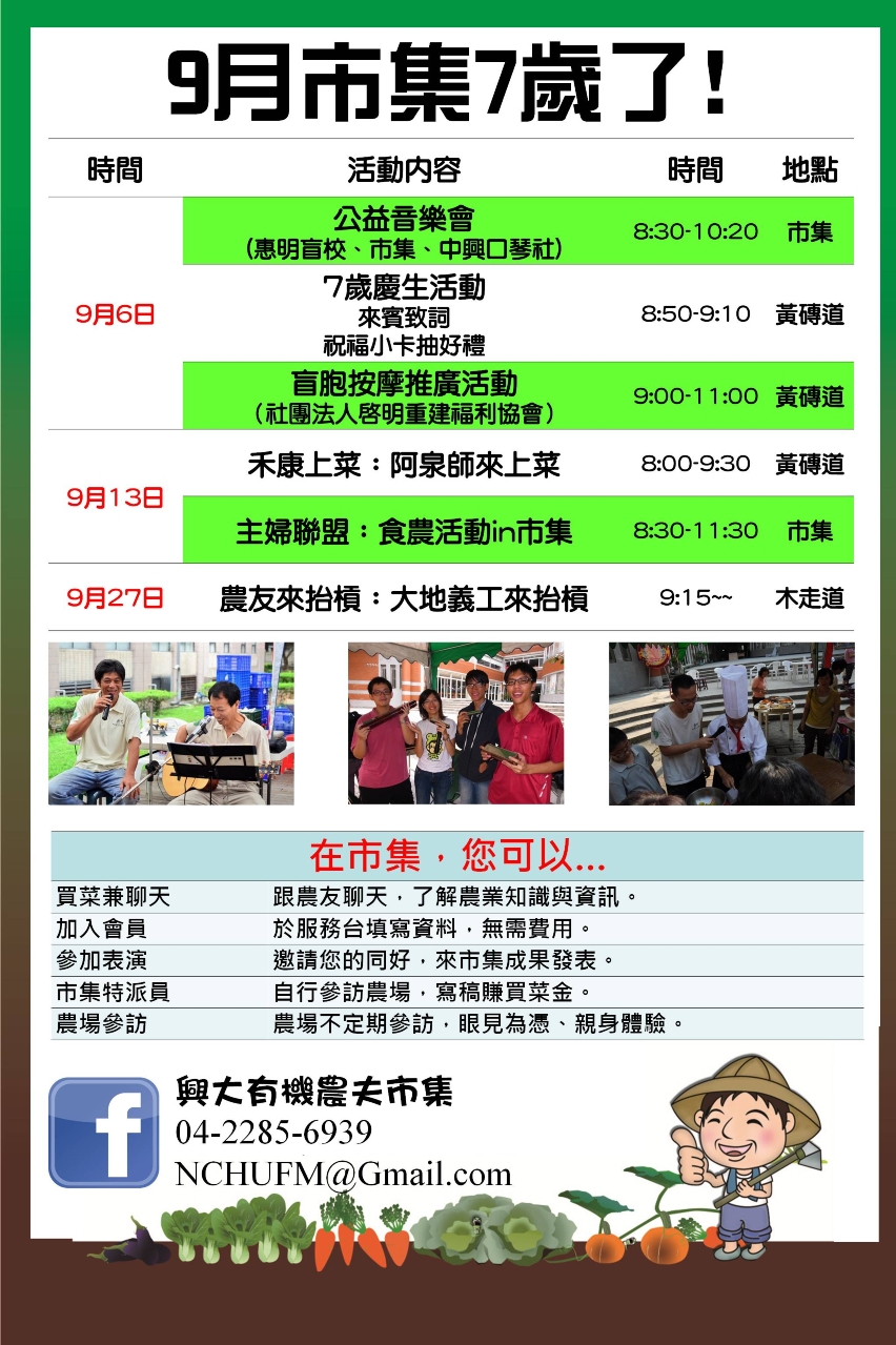 興大有機農夫市集歡慶七週年。 興大有機農夫市集9月6日邀請惠明盲校與興大口琴社舉行公益音樂會。