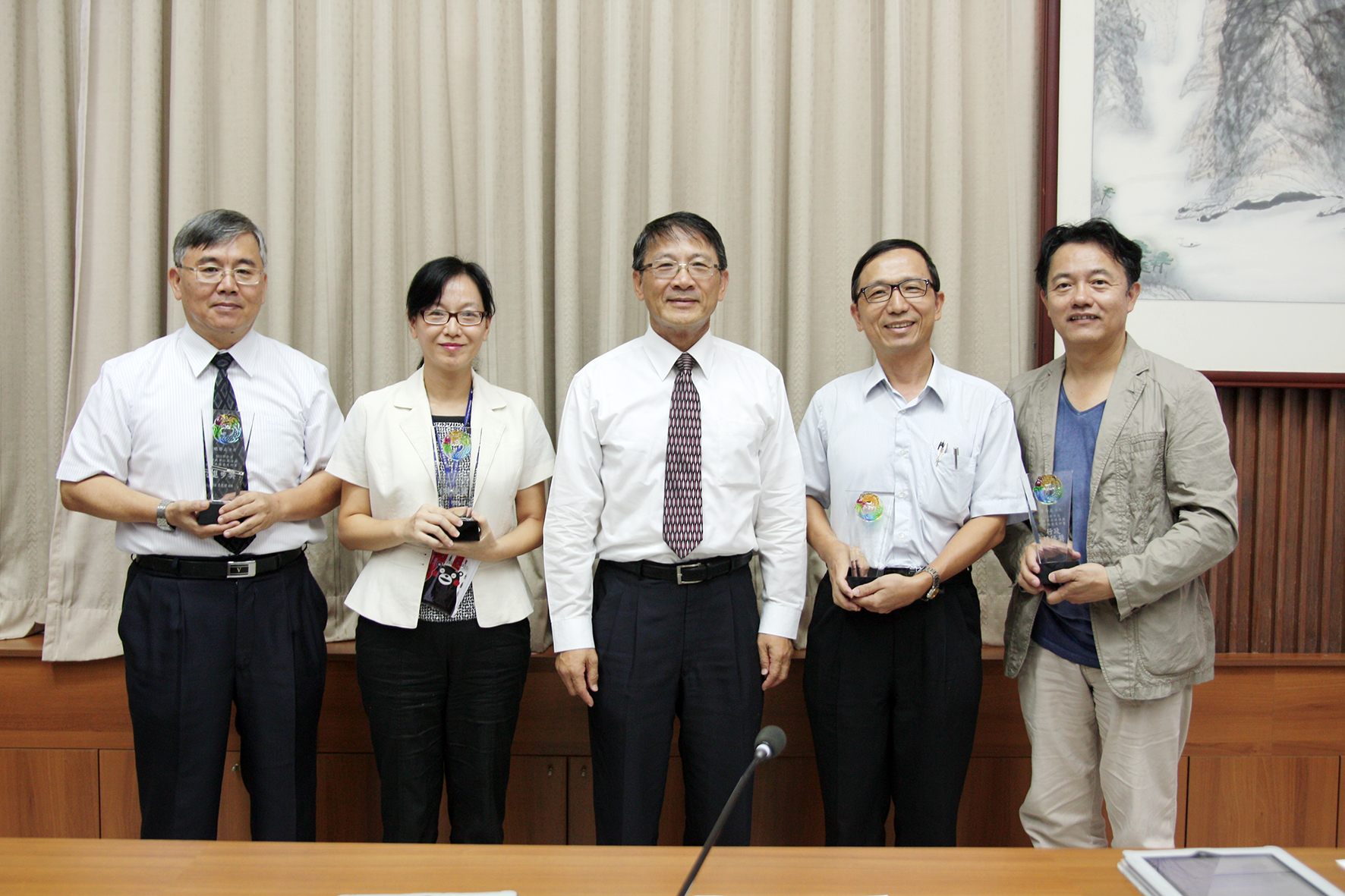 興大校長李德財(中)頒發「102學年度行政單位服務績優」獎項,授獎代表左至右為:方富民總務長、圖書館黃俊升組長、人事室鍾明宏主任、歐聖榮學務長。