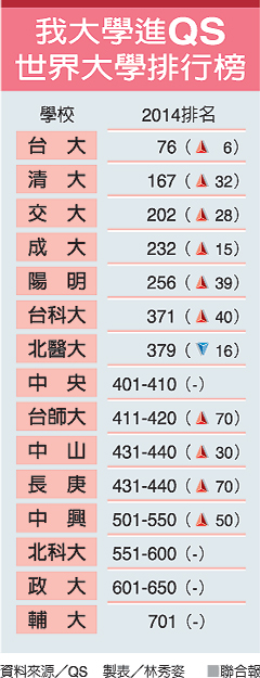 英國高等教育調查公司QS公布2014世界最佳大學排行榜,麻省理工學院蟬聯第一,台灣則共有15所大學進榜,7所順利擠入400大;但只有台大擠入百大,排名第76名,比去年上升6名,為歷年最佳。 台灣的大學在這項全球大學400大排名中為:台大排名76,清大167名,交大202名,成大232名,陽明256名,台科大371名,北醫大379名。 排名從400名起就不再明確排序,以分段區間顯示:中央排名401到410間,台師大411至420間,中山431至440間,長庚431至440間,中興501至550間,北科大551至600間,政大601至650間,輔大701之後。 清大、台科大和台師大排名明顯提升,清大167名,較去年上升32名;台科大排名371,進步幅度41名;台師大排名411-420區間,比去年進步70名。 台大副校長陳良基表示,近幾年因為有教育部邁向頂尖大學計畫的經費支持,增聘不少專案教師,提高學術能量,才使得排名往上升。 台科大校長廖慶榮表示,這幾年根據排名指標,加強培養「具國際移動力的專業人才」,除了增加國際產學合作、歐盟合作,也舉辦國際研討會、選送師生到國外交換、實習,這些成果提高了台科大的國際聲望。 而首度擠進400大的台師大表示,排名躍升的原因是以學術聲譽與國際化表現最佳。台師大校長張國恩說,台師大是世界頂尖華語教學基地,外籍校友包括日本前首相橋本龍太郎、澳洲前總理陸克文、美國駐中國大使洪培博等,國際化指標進步最多。 全球排名前十大名校,多集中在美國和英國,蟬連首位的仍是美國麻省理工學院,並列第2名的是英國劍橋大學以及英國帝國理工學院;第4名美國哈佛大學,並列第5名的是英國牛津大學和英國倫敦大學學院,第7名美國史丹佛大學,第8名美國加州理工學院,第9名美國普林斯頓大學,第10名美國耶魯大學。 亞洲方面,新加坡大學排行第22,是亞洲區第一;香港大學排名雖下滑至28,但仍居亞洲第二;日本東京大學排名31,列亞洲第三。 大陸北京大學則排57。令人意外的是,香港院校如科技大學、城市大學、理工大學等排名齊落。