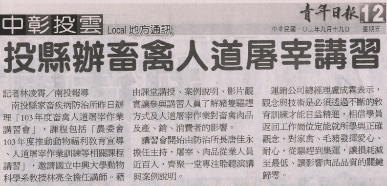 【媒體報導】投縣辦畜禽人道屠宰講習