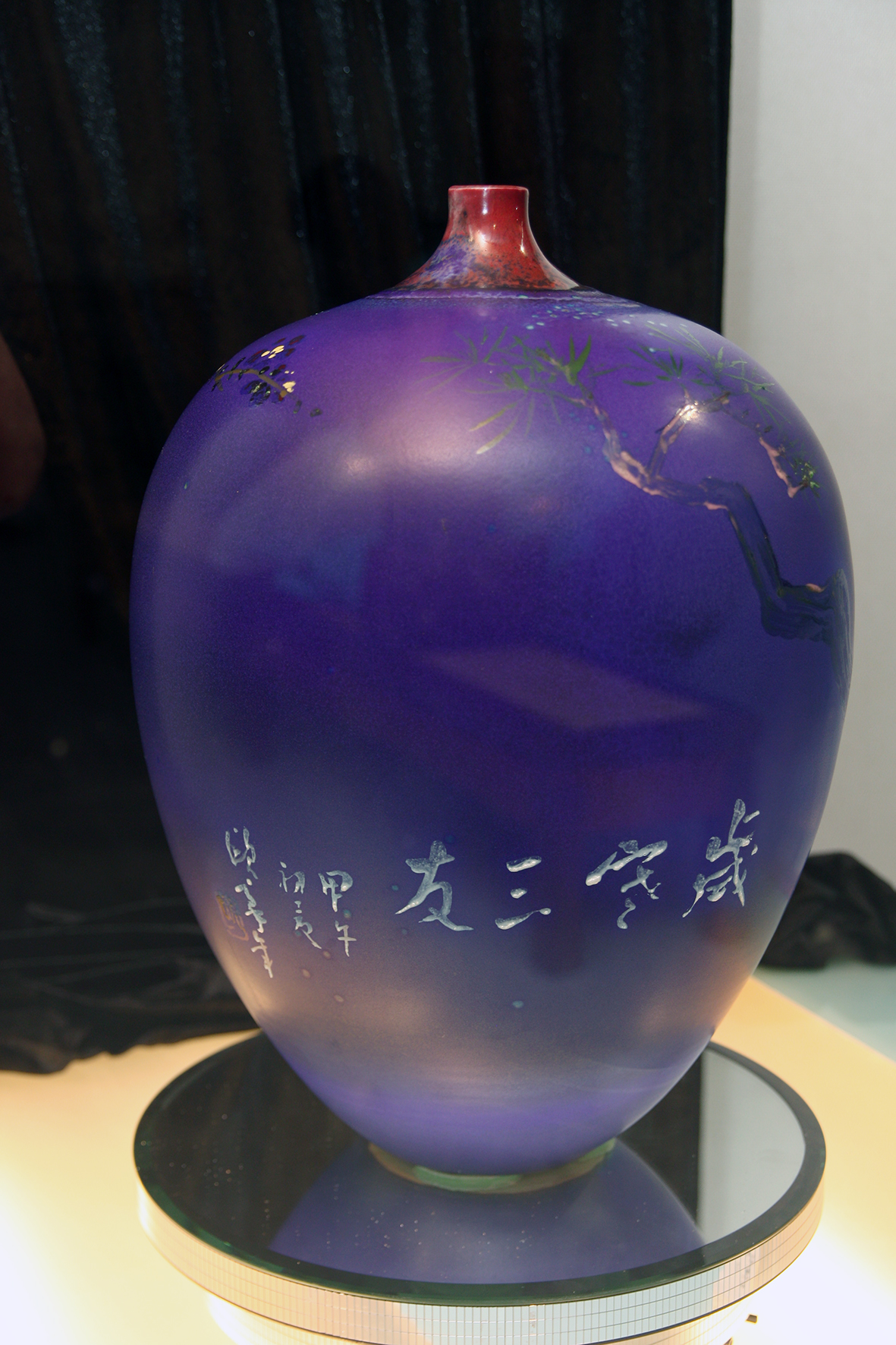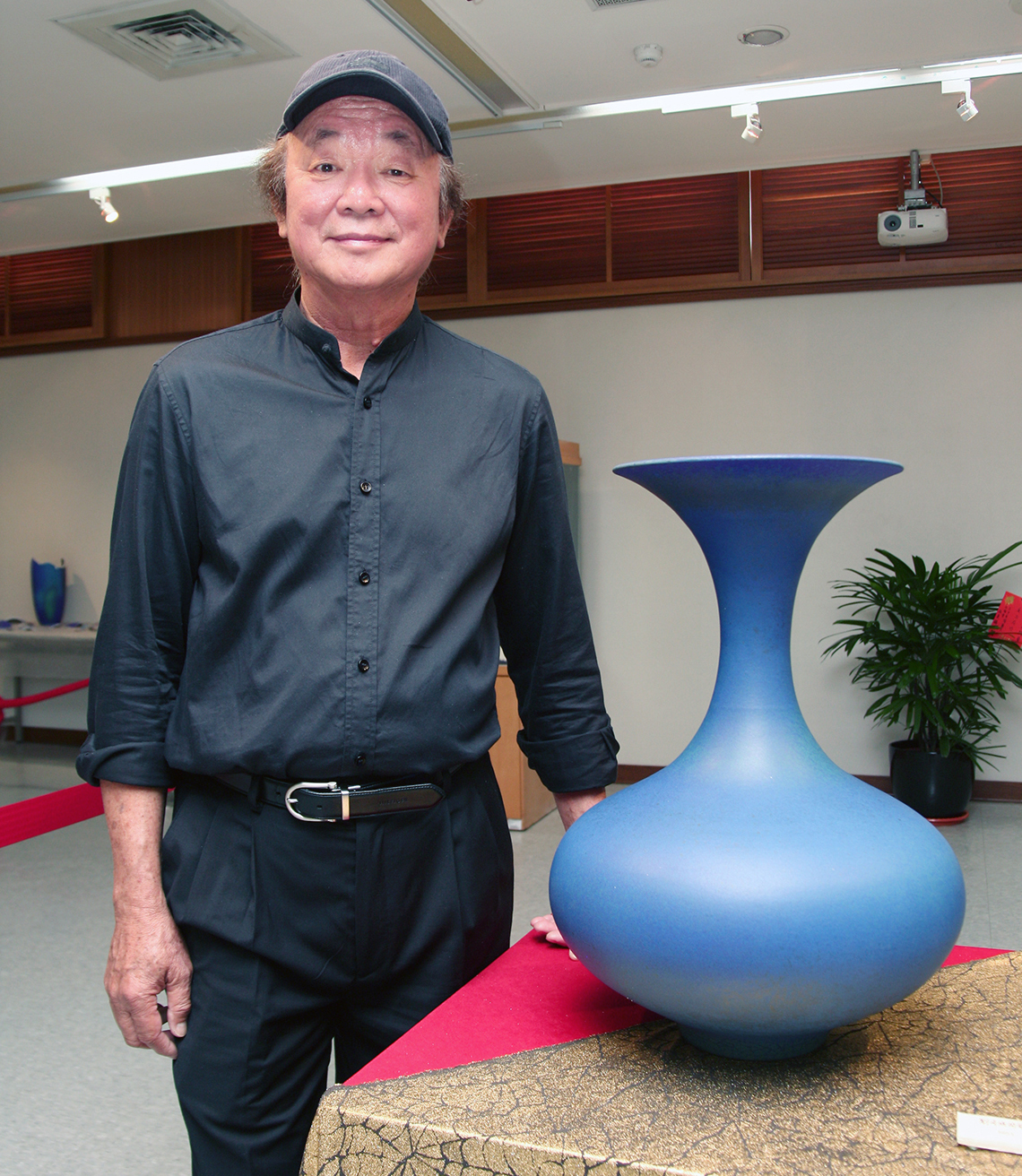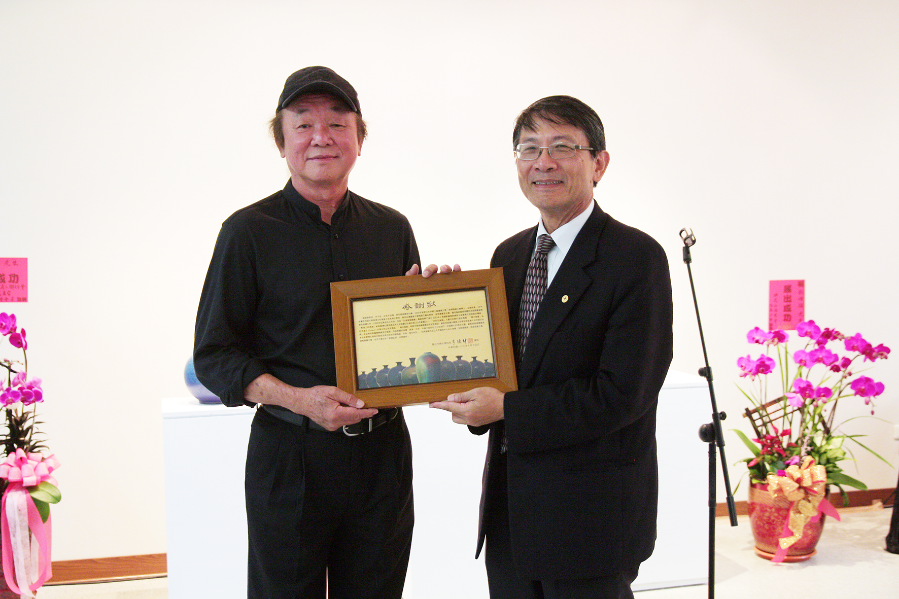 著名旅美陶藝家劉峰雄10月14日至11月13日在興大藝術中心舉辦「攝氏1300度-劉峰雄陶藝個展」,其作品孔雀藍寬口瓶。 興大校長李德財(右)特別頒發感謝狀給劉峰雄,感謝他連續兩年共捐贈約24件陶藝作品作為興大傑出校友與名譽博士之頒獎禮品。 劉峰雄與歐豪年合作的藝術品-歲寒三友。