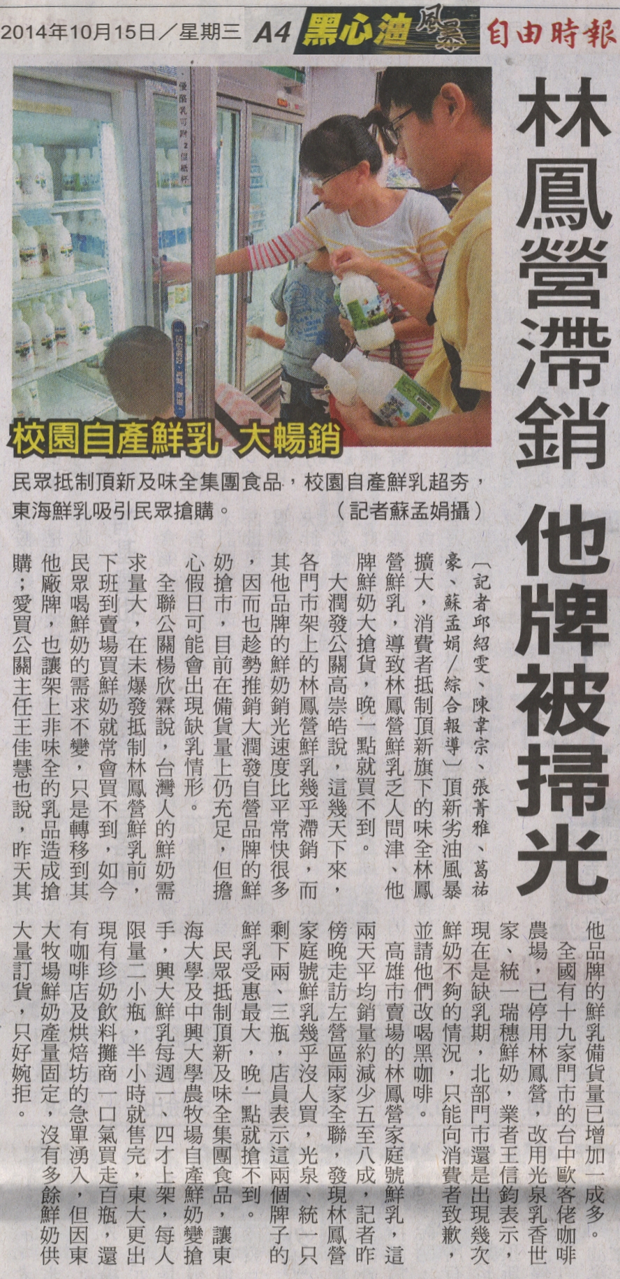 頂新劣油風暴擴大,消費者抵制頂新旗下的味全林鳳營鮮乳,導致林鳳營鮮乳乏人問津、他牌鮮奶大搶貨,晚一點就買不到。