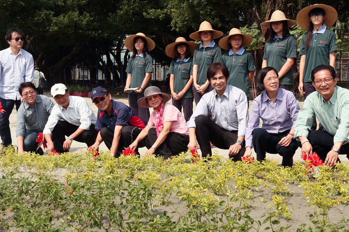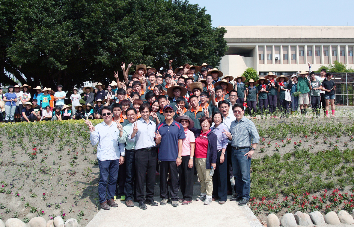 近百位興大、興大附農園藝系學生總動員15、16日兩天在興大康堤栽種植栽。 前排左至右:歐聖榮學務長、陳全木研發長、陳吉仲主秘、李德財校長、校長夫人、林俊良副校長、管院王精文院長、EMBA校友會楊連發理事長,一同在興大康堤栽種花草。 興大校長李德財(前排中)帶領校內主管與負責栽種的興大及興大附農園藝科系學生合影。