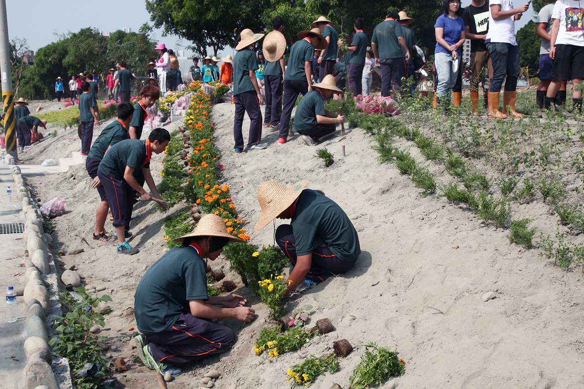 【圖文/媒體公關組】頭戴斗笠、手拿鏟子,近百位中興大學與興大附農的學生在豔陽下賣力種植花草,中興大學自9月中起開始進行「興大康堤」的綠美化工程,經過一個月的整地、舖設景觀步道後,現已進入植栽種植的階段,10月15、16日兩天共出動了近400位園藝科系學生,共同在堤岸種花草,齊力打造優美的水岸景觀。