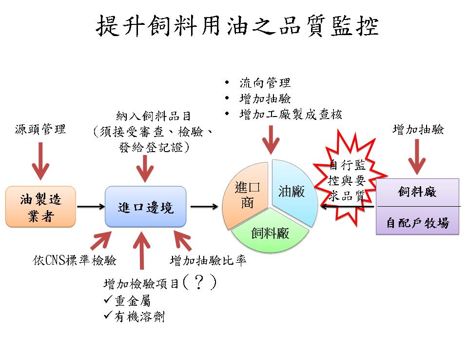每一年國內所需要的飼料用油是很容易計算而得,台灣每年有85萬公噸的肉豬生產量,是由8557家的養豬戶所生產,所需要的飼料量是320萬公噸,其中所需要的飼料用油約是飼料的2%,大約是6.4萬公噸左右,因進口飼料用油的關稅比食用用油的關稅少了14%,加上進口飼料用油較便宜,而讓進口業者有誘因未依規定將飼料用油用於動物上,轉而流向其他用途。故須針對每一用油從生產及進口以至需求的所有通路,廠商要將這些油品的使用資訊公開並登記,如此即可讓政府及社會大眾知道這些油品的流向及使用用途。另外從資訊透明化的角度,政府更應當要儘速將「開放資料政策」(Open Data Policy)與食安管控數據結合,以期重建國際與國內社會對公權力、對商業運作與台灣品牌的信任。