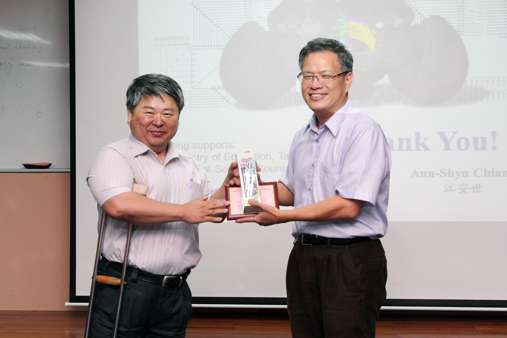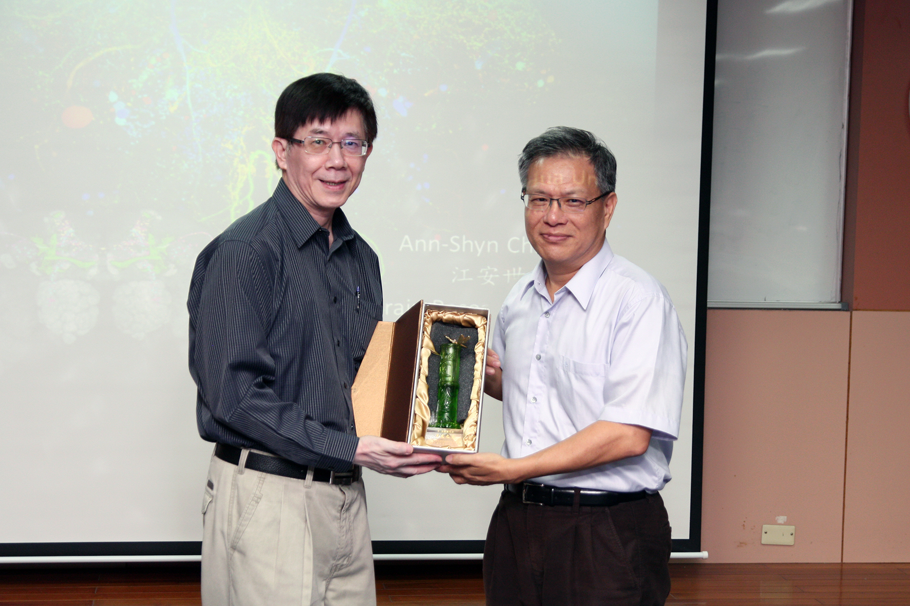 中研院士江安世以「破解大腦」為題10月22日在興大開講。 興大徐堯煇副校長(左)代表學校頒發紀念獎牌給江安世院士。 興大昆蟲系路光暉主任(左)與江安世院士為學長學弟關係,路主任特地邀請江安世返母校演講,並頒發感謝狀及紀念品給江院士。