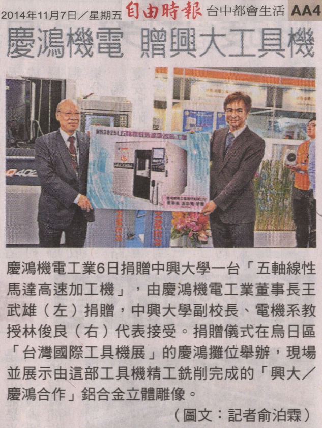 【媒體報導】慶鴻贈中興大學工具機 強化產學合作