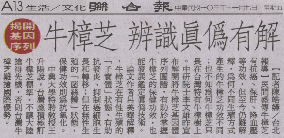 【媒體報導】揭開基因序列 牛樟芝辨識真偽有解