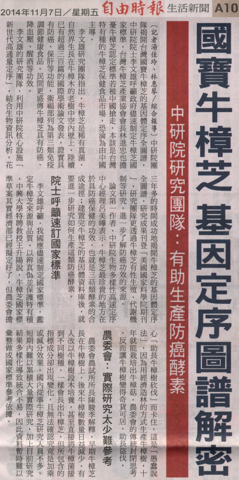 中研院團隊揭開台灣國寶牛樟芝的基因體定序全圖譜,中研院院士李文雄呼籲政府儘速制定牛樟芝國家標準,台灣牛樟芝產業協會會長林進忠也擔憂牛樟芝認定標準若被中國搶走,本該是台灣特有種的牛樟芝保健食品市場,恐淪為由中國主導。