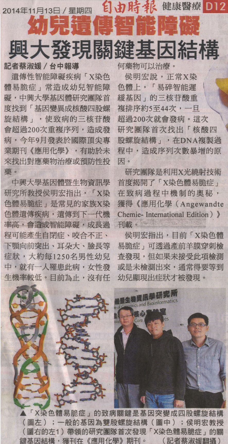 【媒體報導】「幼兒遺傳智能障礙 」興大發現關鍵基因結構