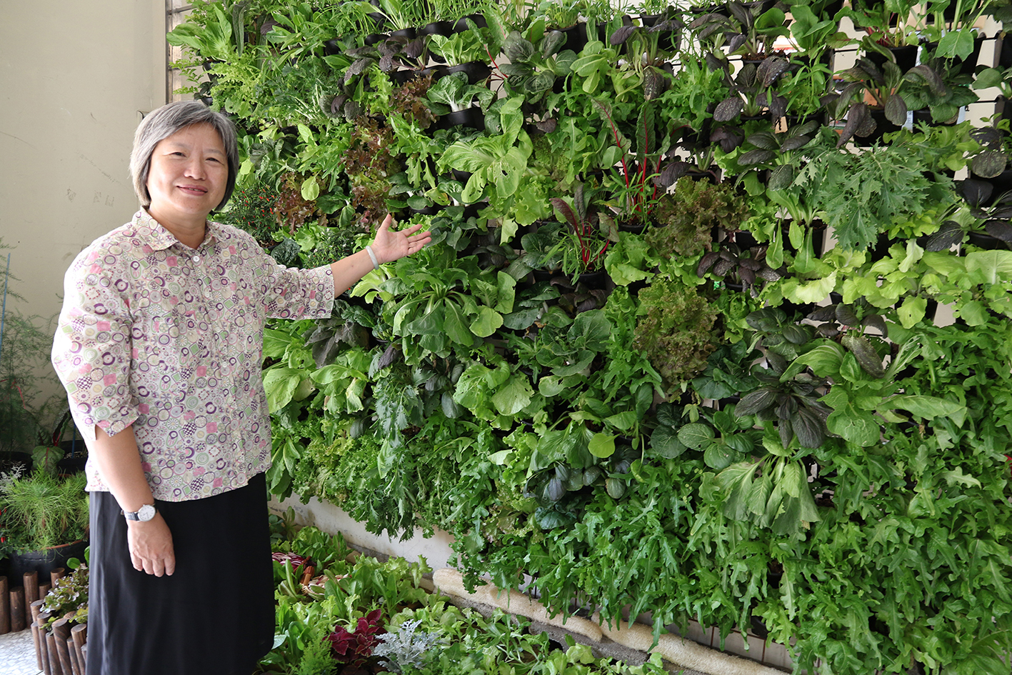 興大園藝系主任宋妤所設計的立體栽培蔬菜牆放置於入口處,將一般家庭常吃的萵苣、空心菜、芥菜、芹菜、辣椒、甜椒等蔬菜種在同一個牆面,她表示,只要做好循環灑水、照明燈等栽培設施,民眾也可在家採用立體栽培的方式自己種蔬菜,不僅方便又節省空間。