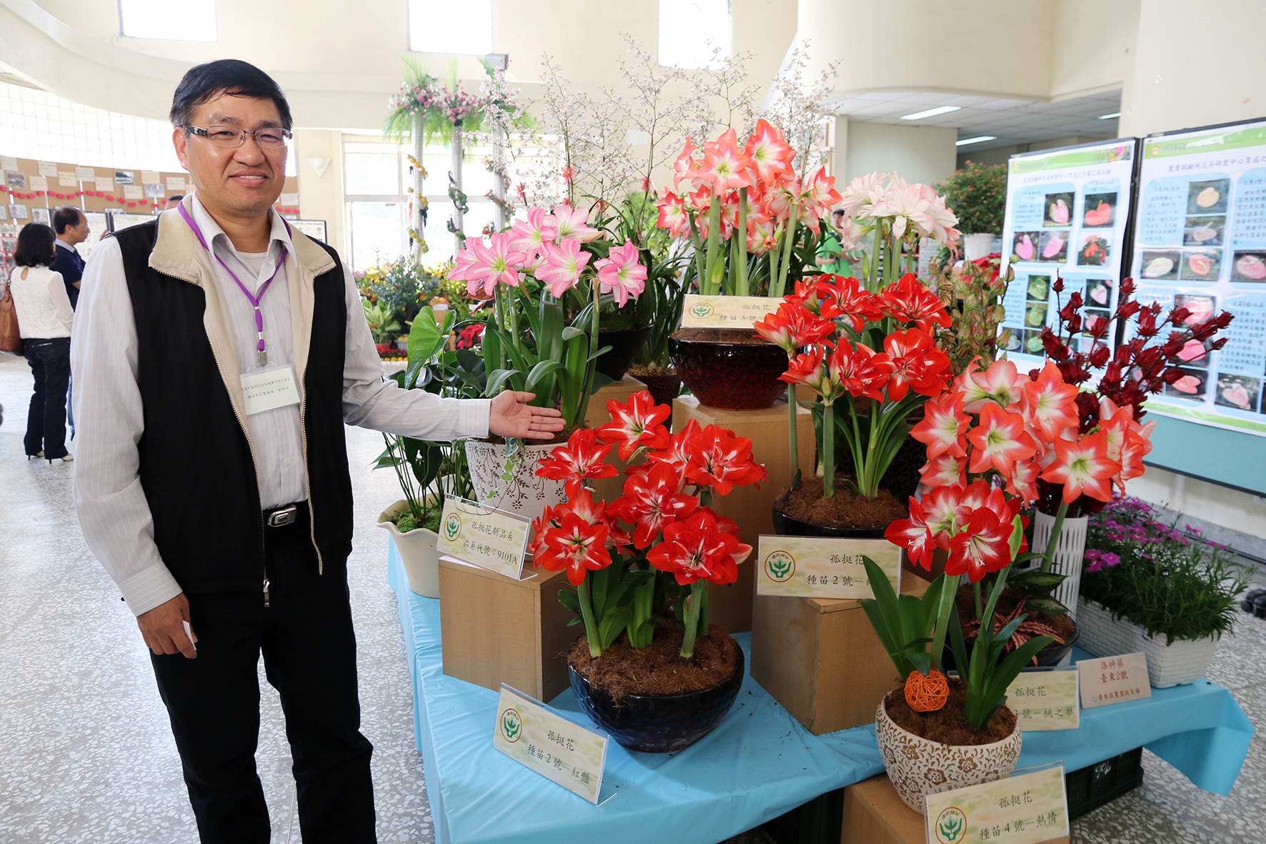 農委會種苗改良繁殖場所育種的孤挺花,包含重瓣孤挺花新品種「種苗一號-粉珍珠」、「種苗二號-紅豔」及單瓣孤挺花新品種「種苗三號-桃之華」、「種苗四號-熱情」也一同展示。種苗改良場課品種改良保護課長劉明宗表示,孤挺花的故鄉位於熱帶中南美洲,以巴西及祕魯為中心,台灣早期由國外引進喇叭花型的孤挺花,由於風土適應性佳,成為國內庭園常見的花卉,孤挺花原為3-4月開花的花種,但種苗改良場改良後現在一年四季皆可開花,目前國內每年所需的切花量約3萬朵,大部分皆靠國外進口,經改良推廣後國內市場的潛力很大,尤其以重瓣又是大紅色、喜氣十足的「種苗二號-紅豔」最受到華人市場歡迎。