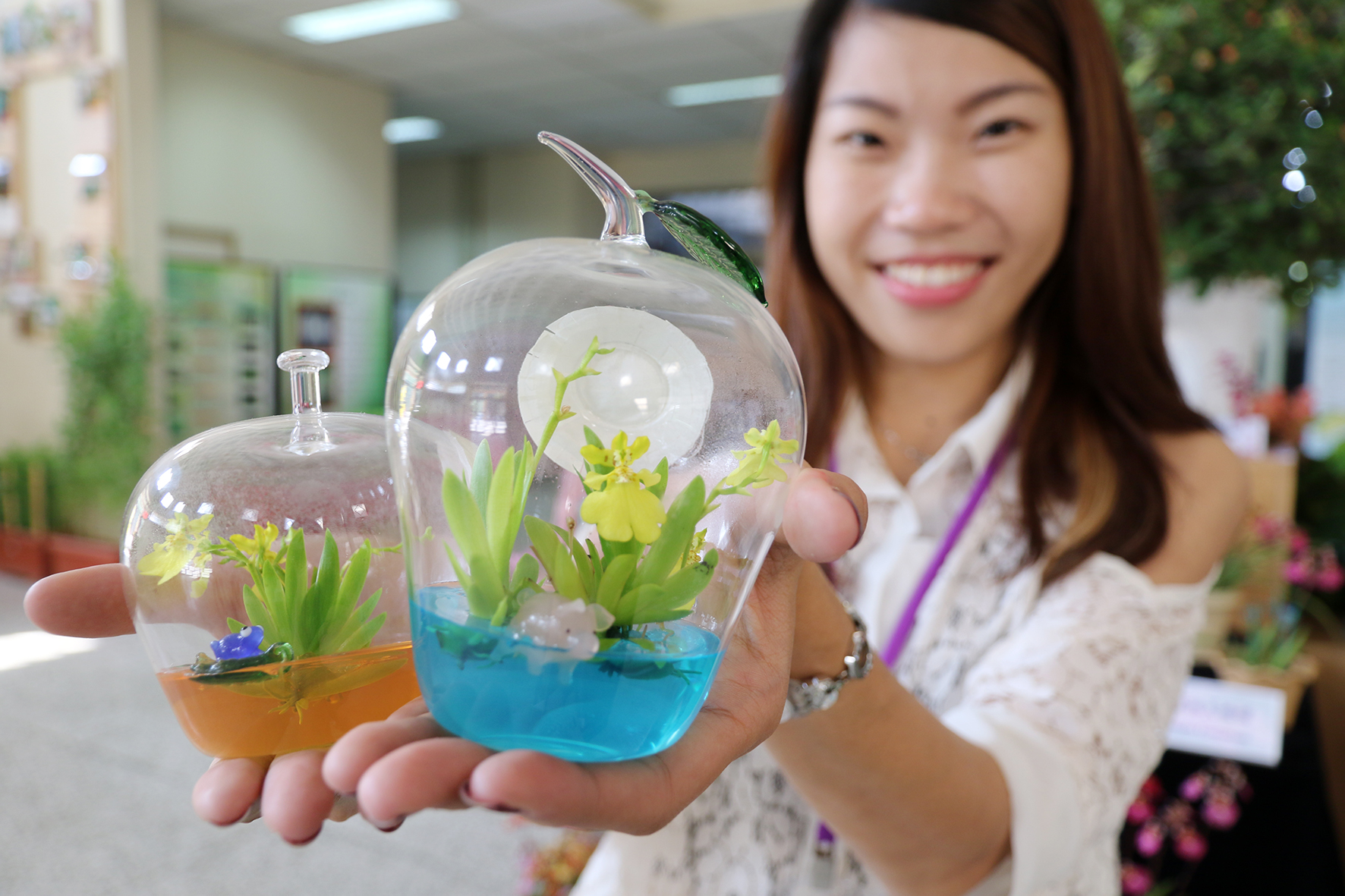 由興大園藝系副教授張正開發的「扇型文心蘭試管花」相當小巧吸睛,5公分大小的黃色扇型文心蘭放入蘋果形狀的玻璃瓶內,不須澆水只須照光,花期可長達半年,研發時間約4-5年,葉片雙邊展開為特殊少見的扇形葉,且經育種後大量減少花辬上的紅色花紋,使整片花辬呈現美麗的金黃色澤,因此又被稱為「興大黃金」,相關技術已成功技轉給業界。