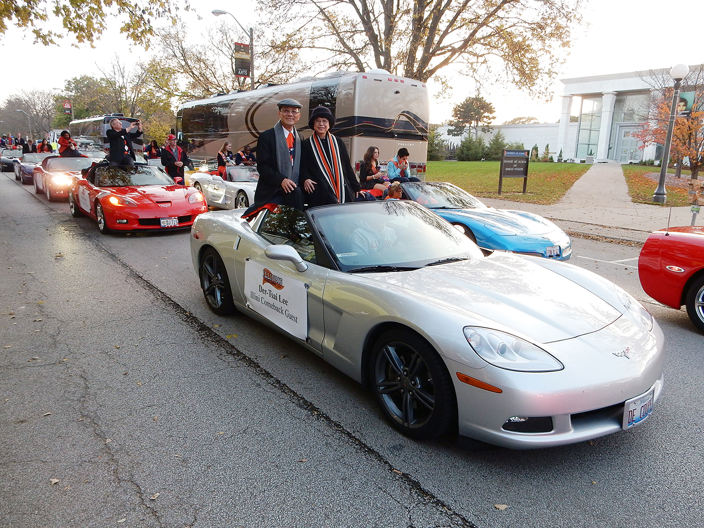 李德財校長伉儷乘坐為「傑出返校校友」(Illini Comeback Guest)準備的敞蓬超跑,進行校園巡禮,沿路受到學生與當地居民的熱烈歡迎。李校長表示很感謝母校的用心規劃,留下相當特殊、令人難忘的體驗。 |
