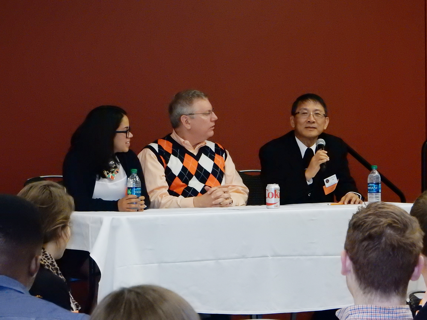 李德財校長(右1)榮獲伊利諾大學2014年「傑出返校校友」(Illini Comeback Guest),與另外兩位得主一起與學生代表們座談,分享人生經驗。