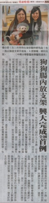 國立中興大學獸醫教學醫院完成國內首例犬隻腸道支架手術,讓一隻馬爾濟斯「囡囡」可順利排便,有更好的生活品質。