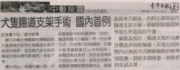 【媒體報導】犬隻腸道支架手術 國內首例