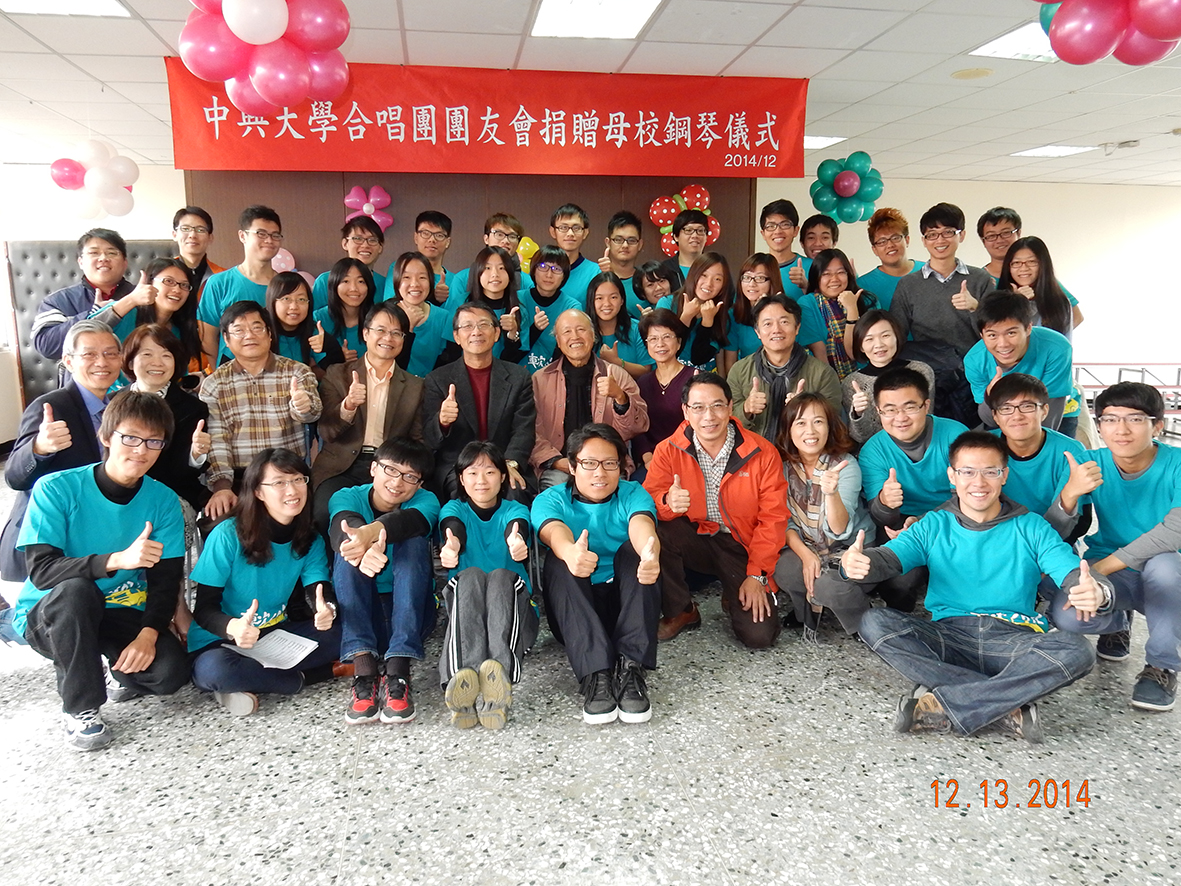 【圖/鄭蕙燕老師提供、文/媒體公關組】國立中興大學合唱團日前(12/13)接受該社團畢業團友捐贈YAMAHA平台鋼琴一部。這是該社團自成立以來,畢業校友首次以捐贈樂器方式造福學弟妹。 中興大學合唱團成立於1951年,至今已超過一甲子的歲月,其間歷經李明訓老師(18年)及吳榮桂老師(40年)之音樂指導,多次榮獲全國合唱比賽佳績。六十幾年以來,合唱團每十年舉辦一次團慶同堂演唱會,2012年之六十代同堂音樂會集聚近兩百位海內外團友返校參與盛會,另外在校團員每年舉辦南部或北部巡迴演唱,各類活動均由畢業團友集資贊助,顯見畢業團友們對母校合唱團向心力十足。而近年來在徐惠君老師(亦為興大附中合唱團指揮老師)指導下,興大合唱團在校團員表現亮眼,在102學年度全國學生音樂比賽中區大專組混聲合唱組,榮獲特優第二名之佳績,並於2014年9月17日與台北市婦女合唱團於國家音樂廳聯合演出,亦是該社團成立以來首次至國家音樂廳演出,其優良表現為本校學生社團於校外添增榮譽。 李德財校長上任後持續關心學生社團,鼓勵同學多參與社團活動。合唱團亦多次承蒙校長及夫人引薦,歷年得以參加台北愛樂文教基金會主辦之音樂營隊,增進同學歌唱技術與實力。合唱團同學們表示很感謝校長與夫人推薦,讓他們能在今年進入國家最高音樂殿堂演出,成為畢生難忘的經驗與榮譽。 本次捐贈鋼琴活動發起人為中文系畢業校友第23代團友倪燦溶學長,發動了合唱團校友85人共同集資購買YAMAHA C3X平台鋼琴。掌管學生社團的學務處課指組亦提供很多行政協助與場地支援。畢業學長姐們提供新鋼琴給合唱團專用,募款基金亦已設置鋼琴後續維護費用,以支持學弟妹們繼續合唱、且能唱得更好;也希望合唱團建立自我管理機制,能好好經營及管理社團。跨越60屆的校友能一起來成全學弟妹的社團活動,實屬難得,希望學弟妹能體會及珍惜! 此次合唱團團友會實體捐贈鋼琴給社團,亦提供畢業校友回饋母校的創新模式;透過校友對學生社團捐贈課外活動所需設備與物資,將能提高學生參與社團的動力與向心力。合唱團團友會期望更多喜愛歌唱的在校同學能踴躍加入這個已63年歷史的大家庭。 捐贈儀式於12月13日在學生活動中心401教室舉行,在李德財校長、貴賓及畢業團友致詞後,進行揭琴儀式,團友會代表與李校長互贈鋼琴與感謝狀,在校團員配合新鋼琴啟用演唱數首動聽曲目,贈琴活動過程相當溫馨感人。