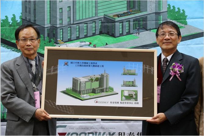 中興大學機械工程學系歡度創系50週年系慶,舉辦系友楊德華(左)捐贈興大「工具機技術研發大樓」的簽約儀式,由校長李德財(右)代表接受建物示意圖。