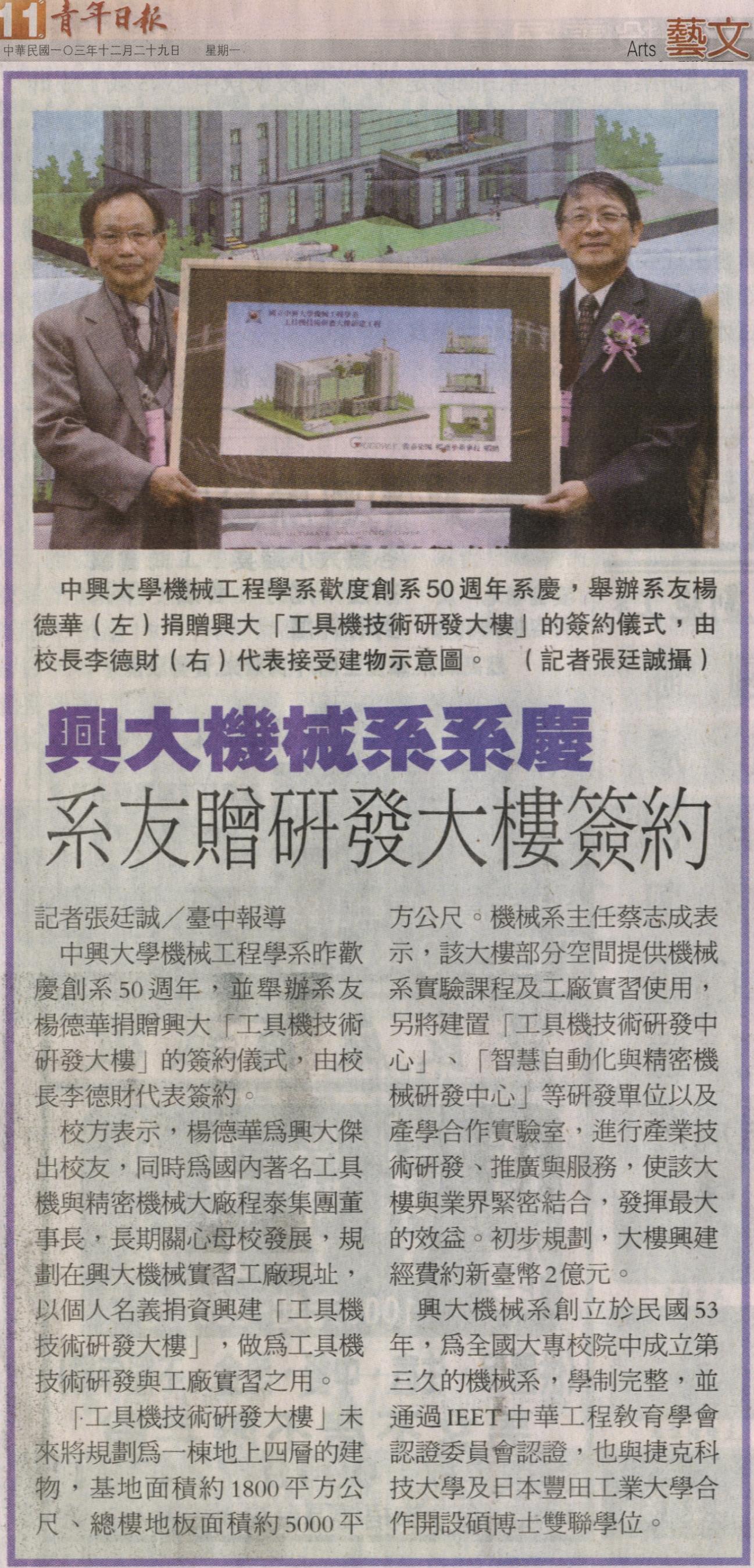 【媒體報導】興大機械系系慶 系友贈研發大樓簽約