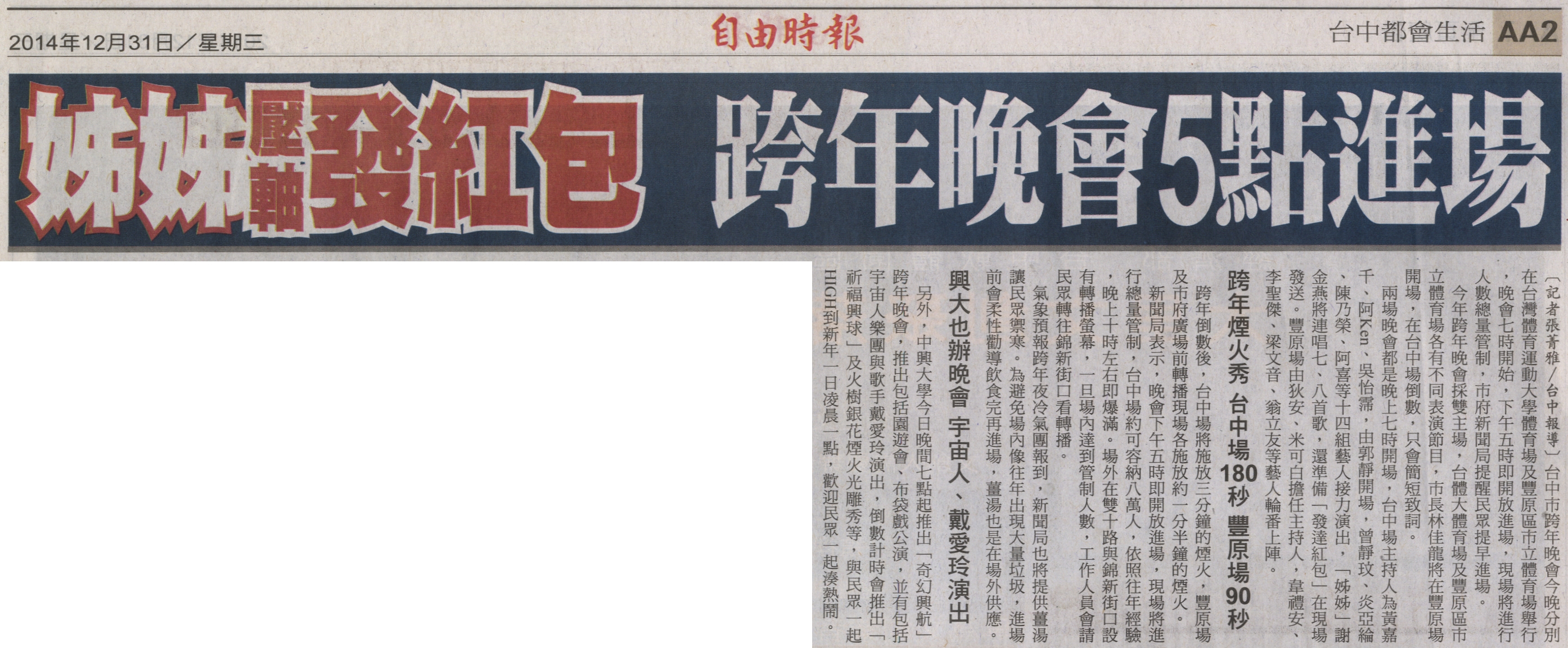 稿源:2014-12-31/自由時報/AA2/張菁雅/台中
