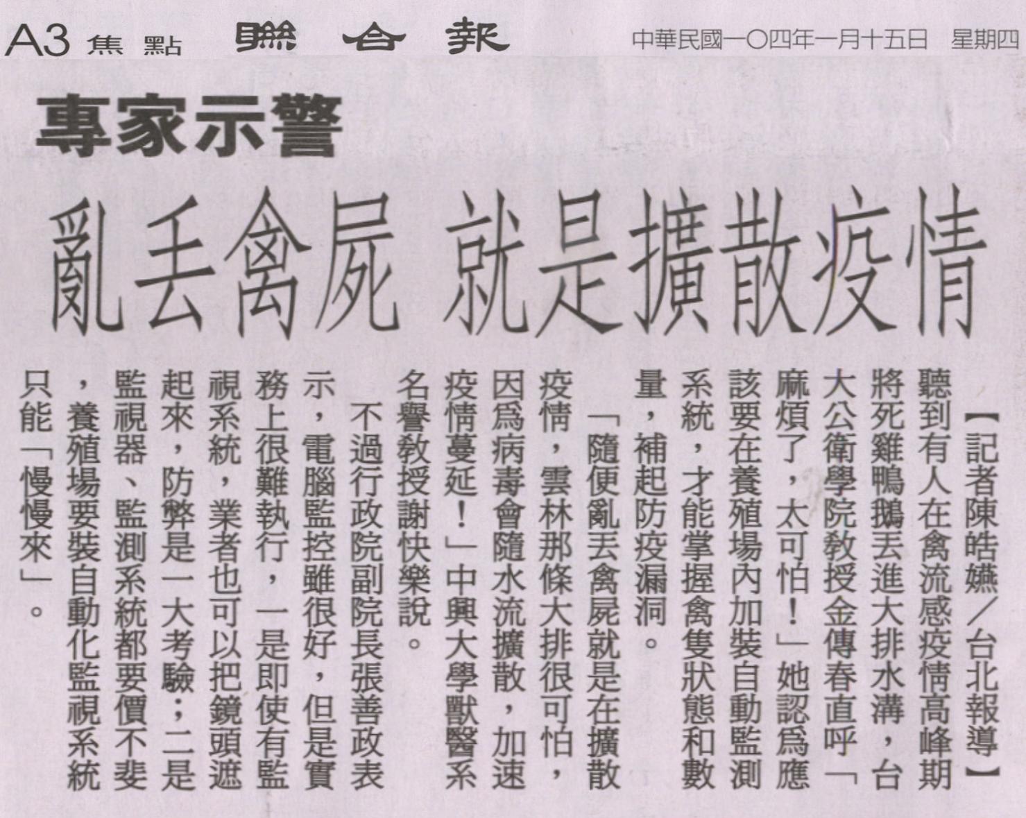 【媒體報導】專家示警 亂丟禽屍 就是擴散疫情