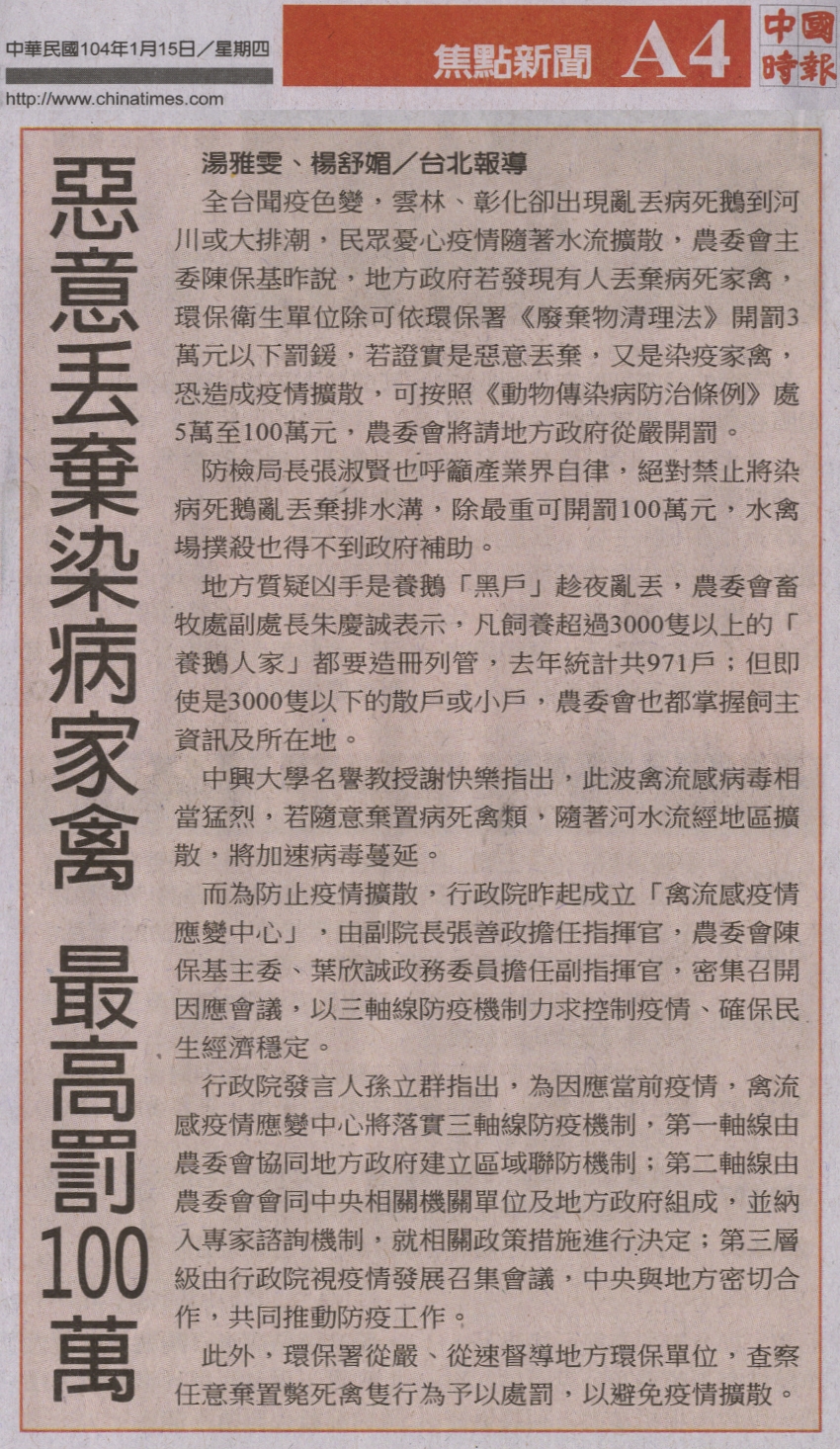 全台聞疫色變,雲林、彰化卻出現亂丟病死鵝到河川或大排潮,民眾憂心疫情隨著水流擴散,農委會主委陳保基昨說,地方政府若發現有人丟棄病死家禽,環保衛生單位除可依環保署《廢棄物清理法》開罰3萬元以下罰鍰,若證實是惡意丟棄,又是染疫家禽,恐造成疫情擴散,可按照《動物傳染病防治條例》處5萬至100萬元,農委會將請地方政府從嚴開罰。