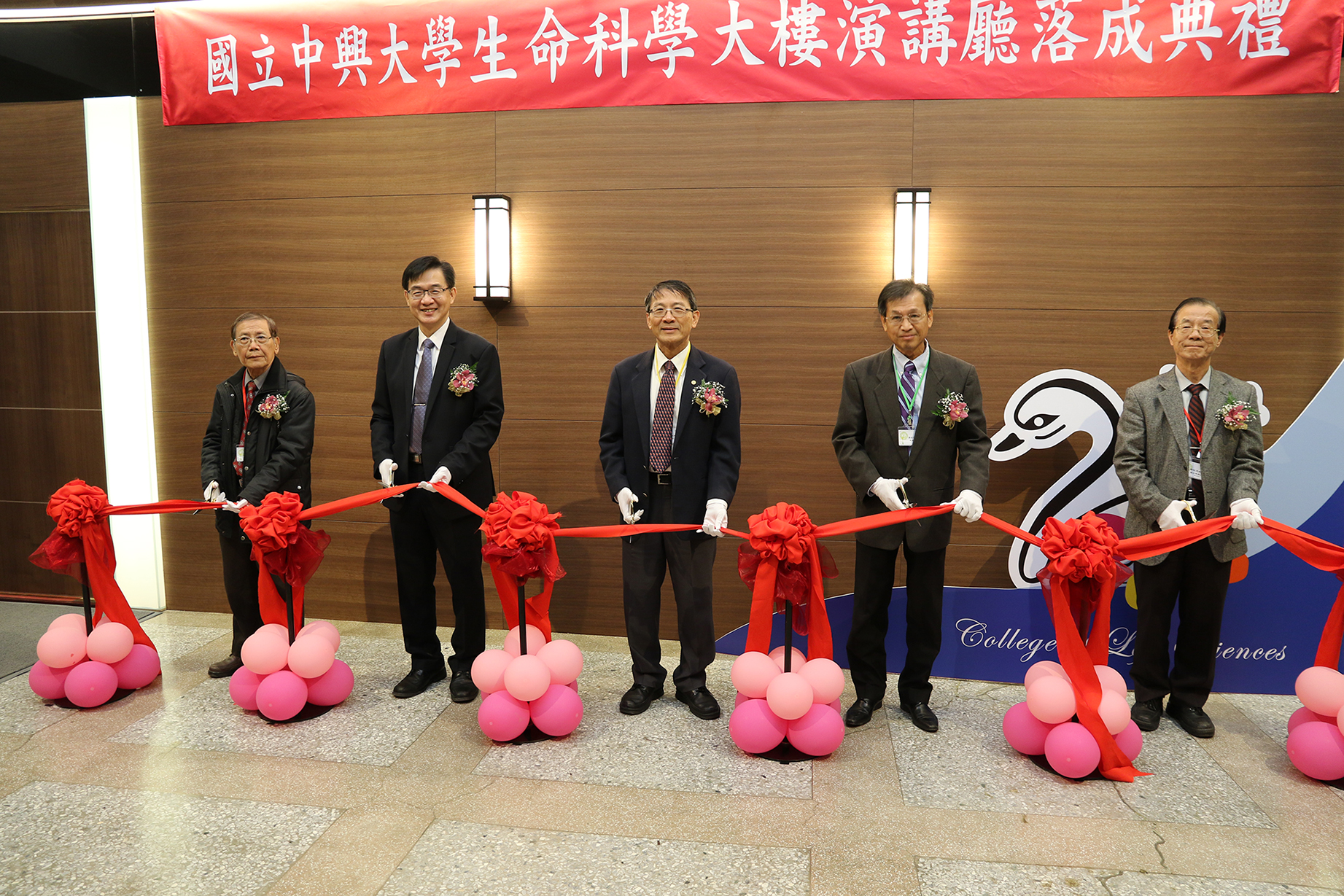 中興大學生命科學院1月17日歡慶創院20周年,舉辦演講廳啟用剪綵儀式。與會貴賓與傑出校友於會後大合照。