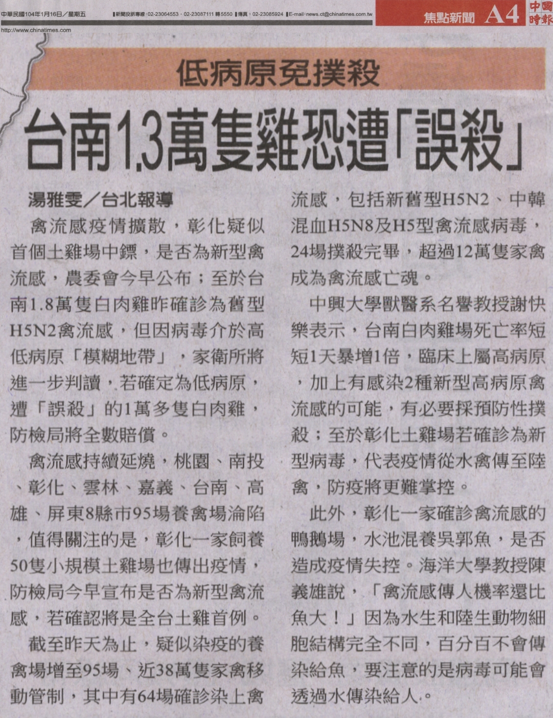 中興大學獸醫系名譽教授謝快樂表示,台南白肉雞場死亡率短短1 天暴增1倍,臨床上屬高病原,加上有感染2種新型高病原禽流感的可 能,有必要採預防性撲殺;至於彰化土雞場若確診為新型病毒,代表 疫情從水禽傳至陸禽,防疫將更難掌控。