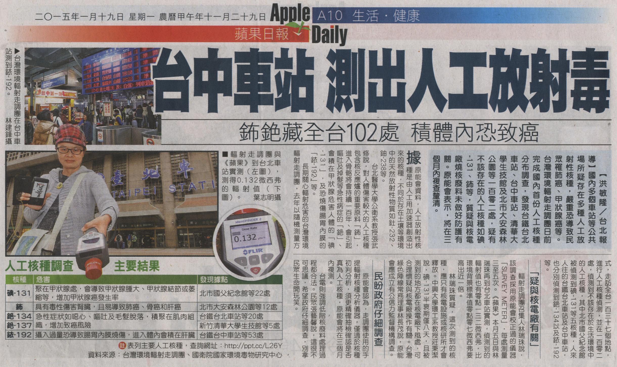 國內多個車站等公共場所疑存在多種人工放射性核種,嚴重恐導致民眾罹肺癌、甲狀腺癌等。台灣環境輻射走調團日前完成國內首份人工核種分布調查,發現台鐵台北車站、台中車站、清華大學生技館及北市大安森林公園等一百零二處,疑有不該存在的人工核種如碘-131、鈽等,質疑與核電廠燒核廢料未做好防護有關。原能會表示,將在三個月內複查釐清。