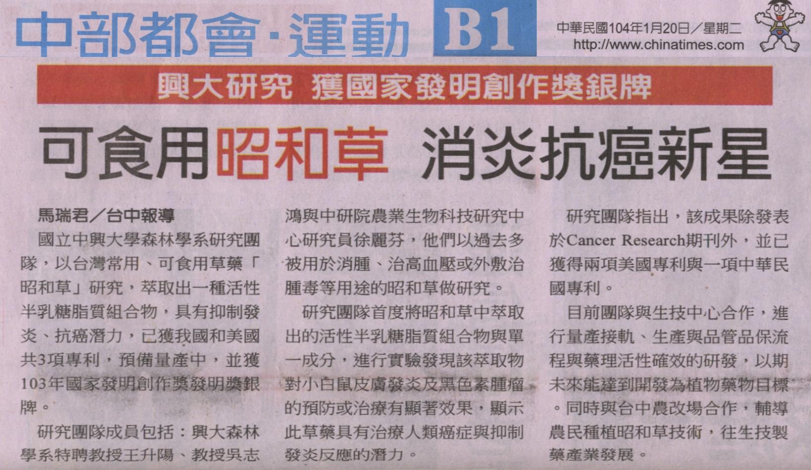 【媒體報導】可食用昭和草 消炎抗癌新星