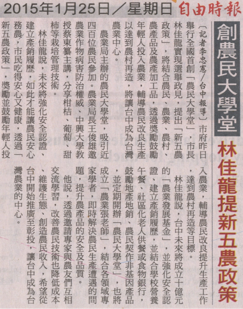 【媒體報導】創農民大學堂 林佳龍提新五農政策