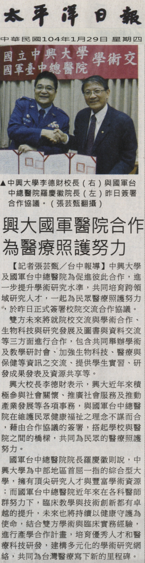 【媒體報導】興大與國軍台中總醫院簽署合作協議 共同為民眾醫療照護努力