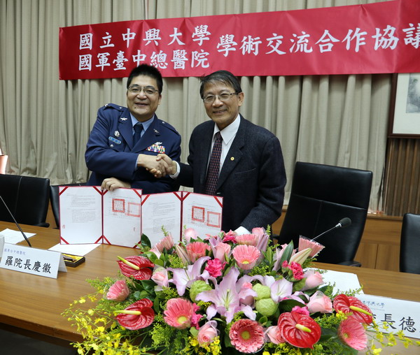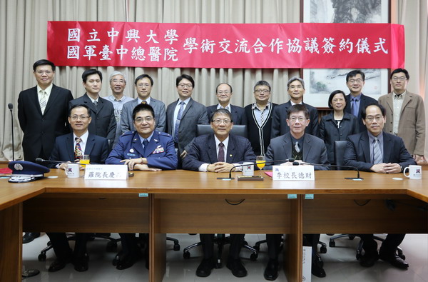 中興大學及國軍臺中總醫院為促進彼此合作,進一步提升學術研究水準,將科技與醫療結合,共同培育跨領域研究人才,一起為民眾醫療照護努力,於104年1月28日假中興大學簽署校院交流合作協議。中興大學由李德財校長代表、國軍臺中總醫院由羅慶徽院長代表進行簽署儀式。
