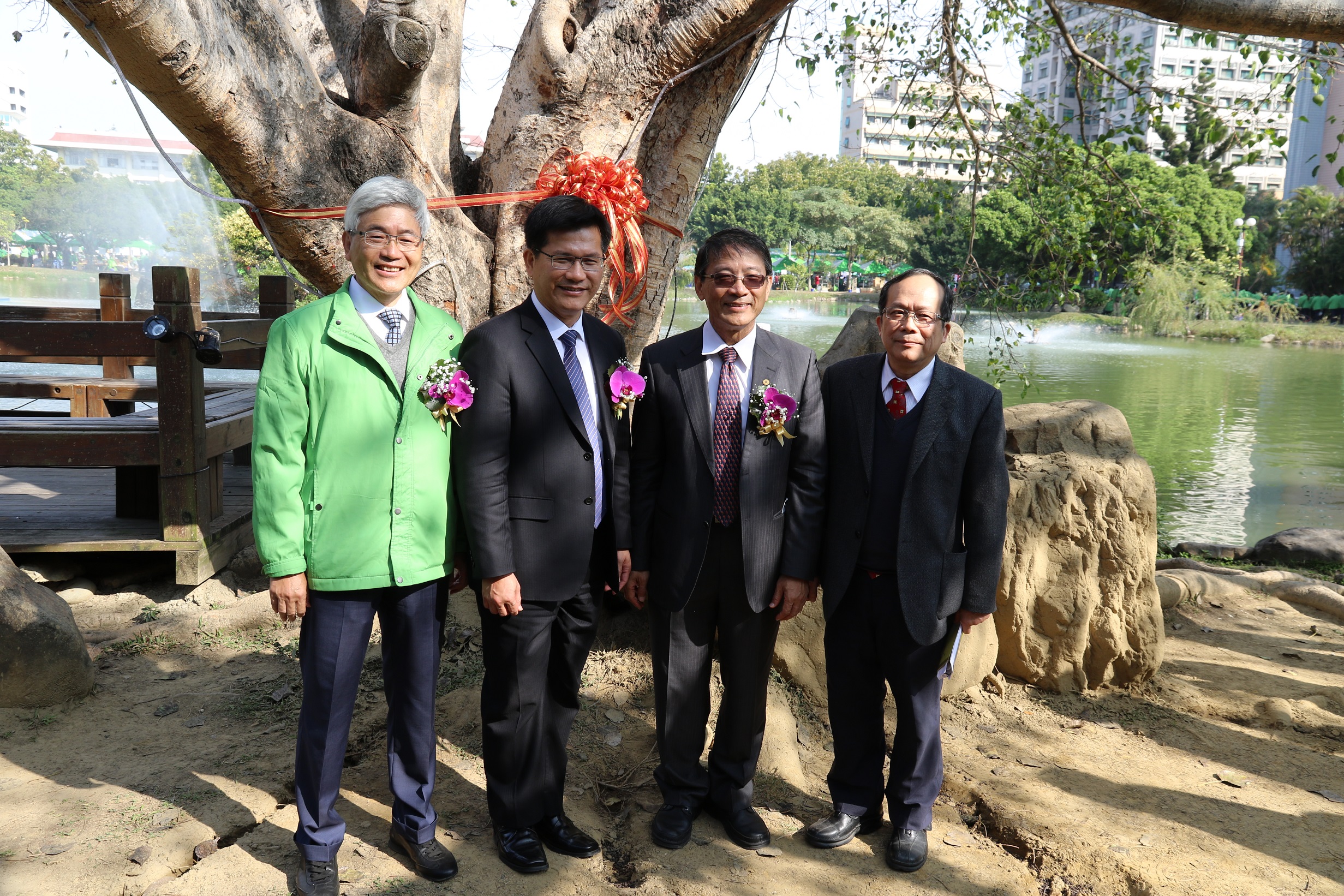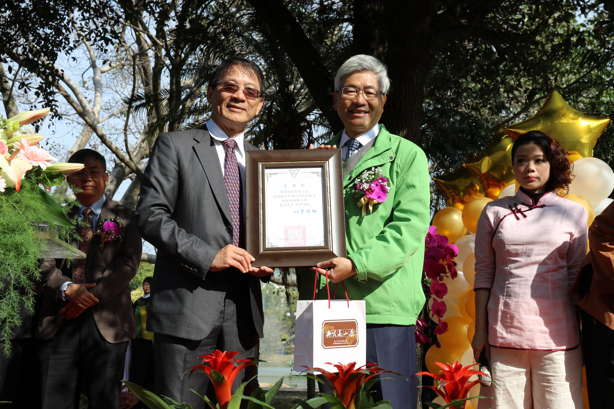 台中市市長林佳龍、興大校長李德財、興農集團董事長楊文彬及興大植病系教授黃振文施肥後於老樹前合影。興大校長李德財致贈興農集團楊文彬董事長感謝狀。