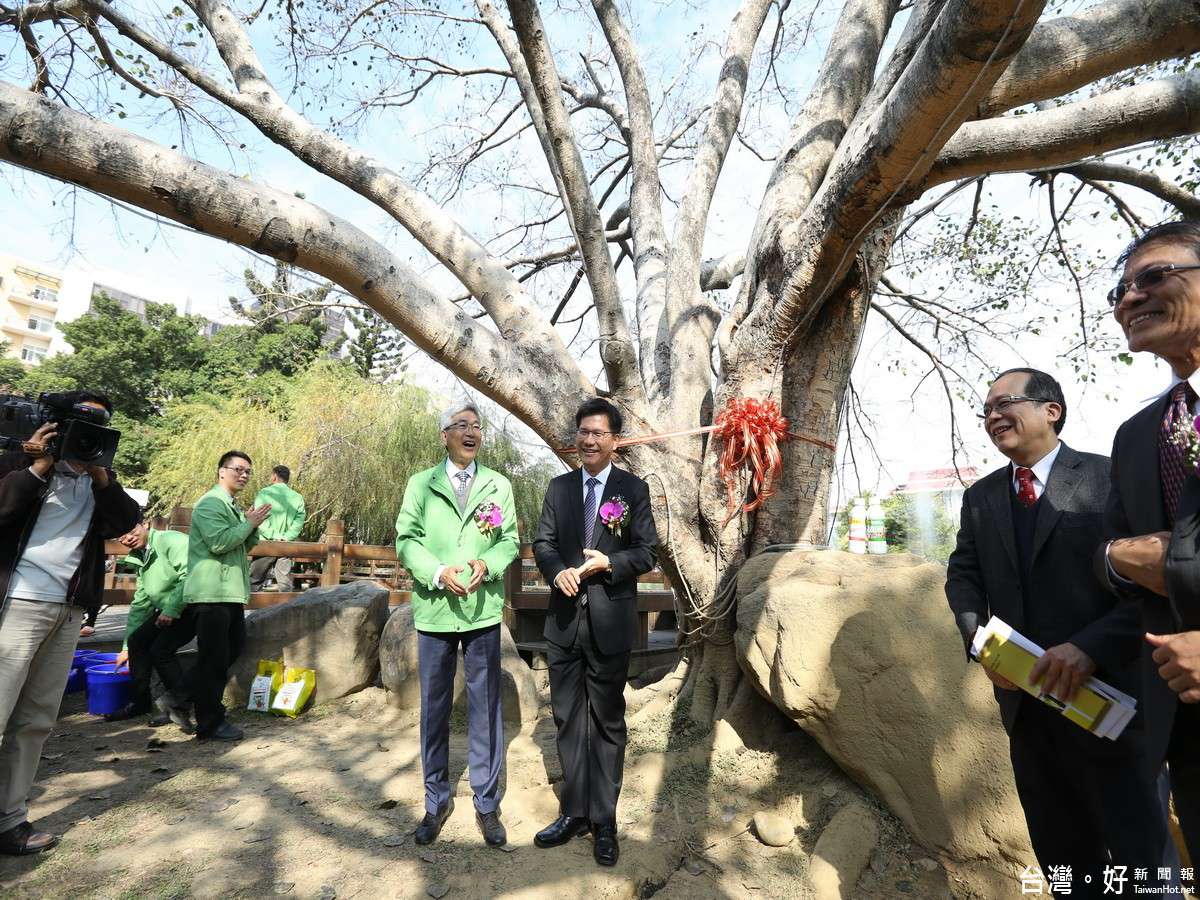 林市長、市府農業局長王俊雄、興農董事長楊文彬、中興大學校長李德財、興大附農校長李林滄及2000多位身穿綠色制服的興農員工,一同在中興湖四周為樹木施肥,希望藉此讓興農從鄉村走回都市,建立拯救老樹及綠地的能力。
