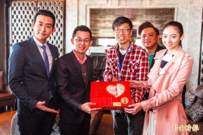 電視劇「長不大的爸爸」到台中取景,台中市政府新聞局長卓冠廷(左二)帶太陽餅探班。(記者張菁雅攝)
