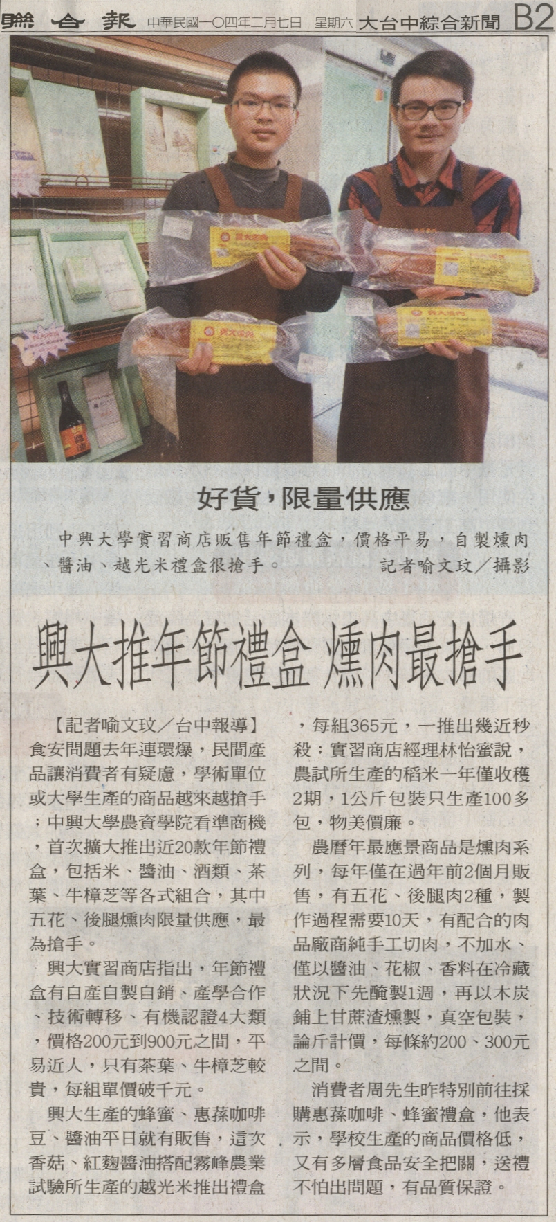 【媒體報導】興大推年節禮盒 燻肉最搶手