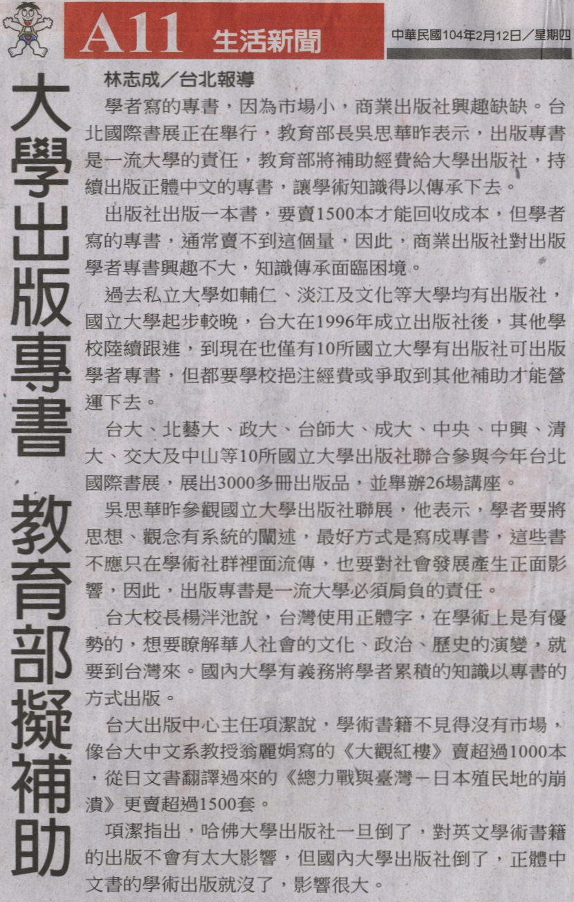 學者寫的專書,因為市場小,商業出版社興趣缺缺。台北國際書展正在舉行,教育部長吳思華昨表示,出版專書是一流大學的責任,教育部將補助經費給大學出版社,持續出版正體中文的專書,讓學術知識得以傳承下去。