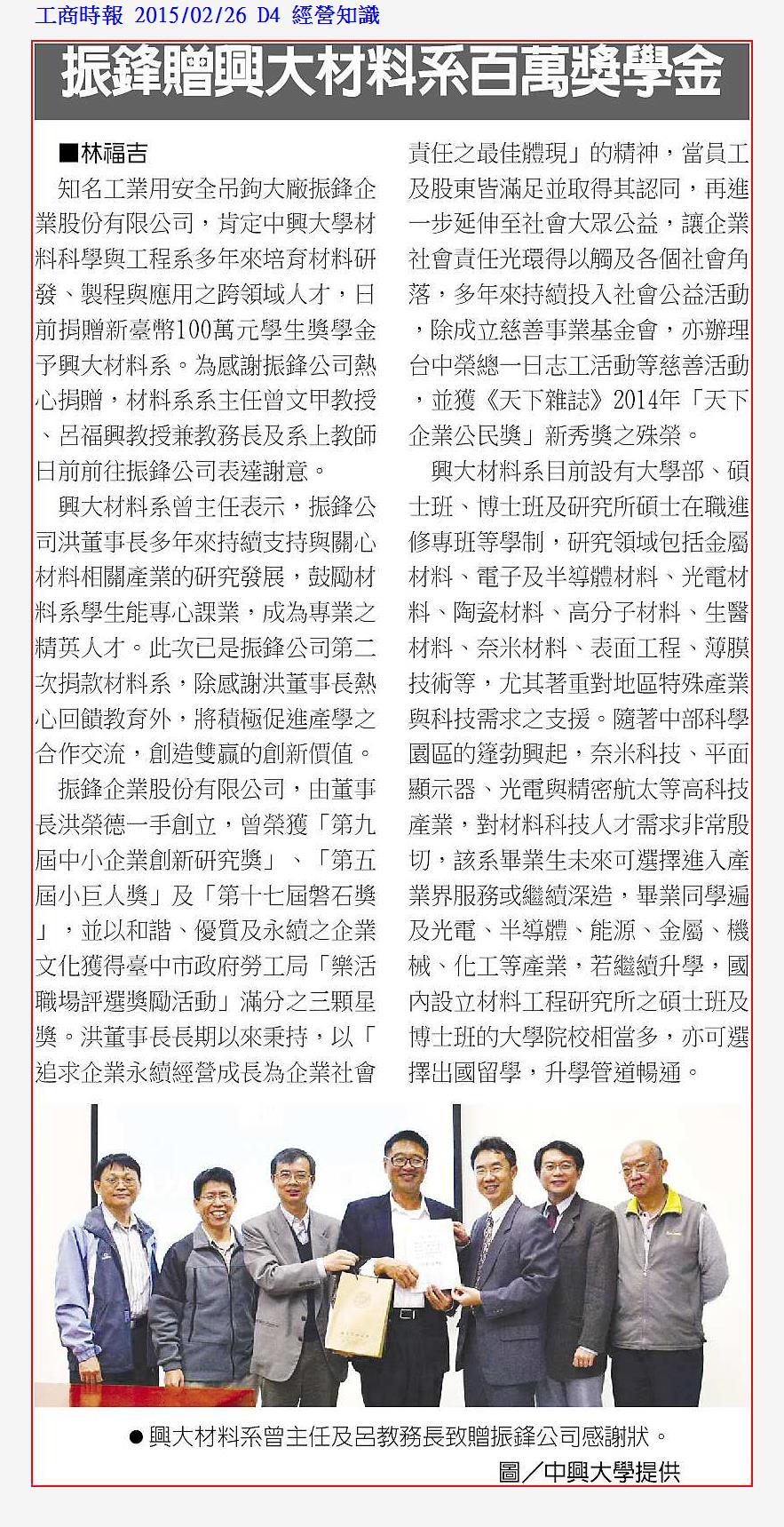 興大材料系曾主任表示,振鋒公司洪董事長多年來持續支持與關心材料相關產業的研究發展,鼓勵材料系學生能專心課業,成為專業之菁英人才。此次已是振鋒公司第二次捐款材料系,除感謝洪董事長在企業有成之餘,不忘熱心回饋教育之外,將積極促進產學間之合作交流,創造雙贏的創新價值。
