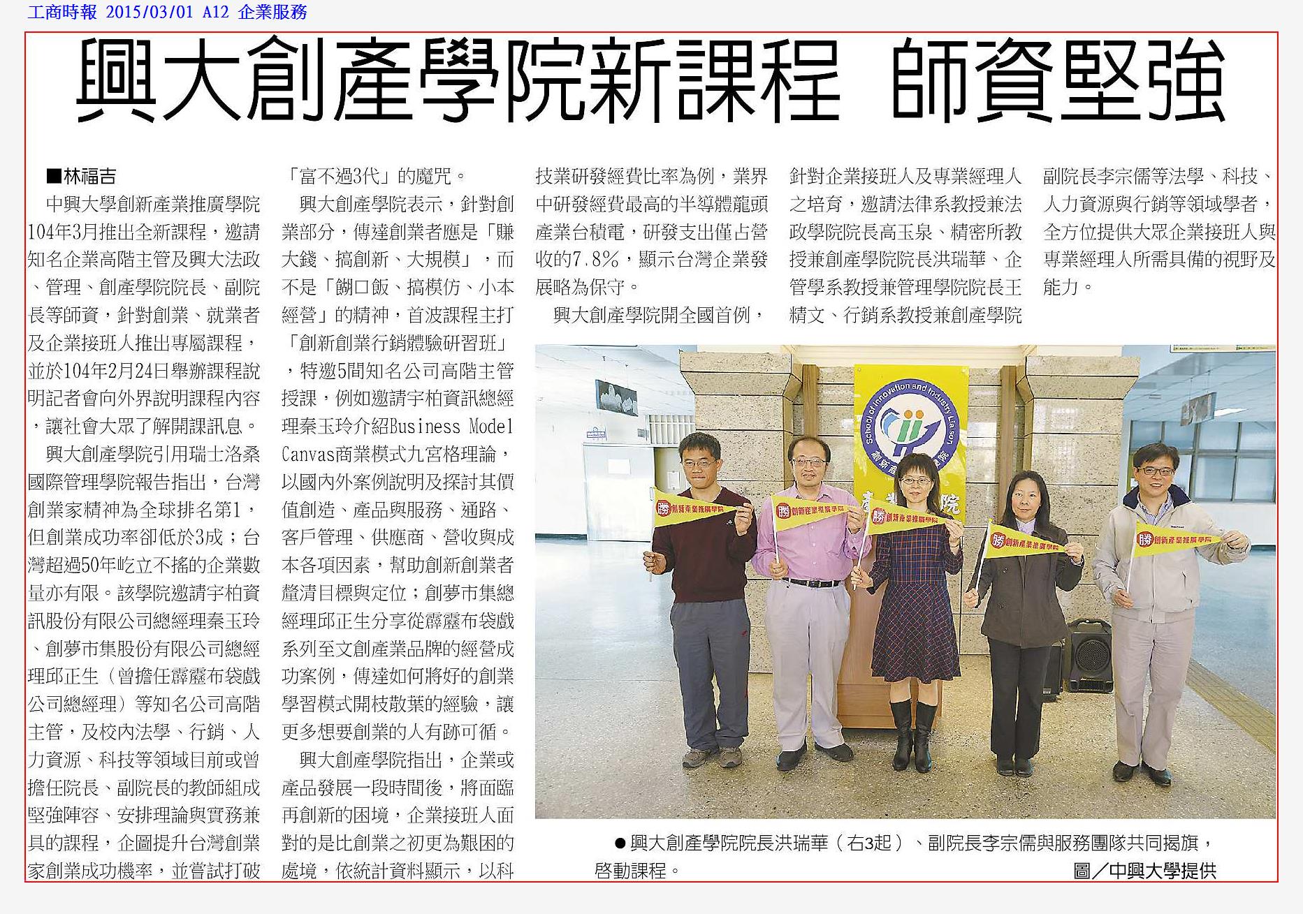 興大創產學院表示,針對創業部分,傳達創業者應是「賺大錢、搞創新、大規模」,而不是「餬口飯、搞模仿、小本經營」的精神,首波課程主打「創新創業行銷體驗研習班」,特邀五間知名公司高階主管授課,例如邀請宇柏資訊秦總經理介紹Business Model Canvas商業模式九宮格理論,以國內外案例說明及探討其價值創造、產品與服務、通路、客戶管理、供應商、營收與成本各項因素,幫助創新創業者釐清目標與定位;創夢市集邱總經理分享從霹靂布袋戲系列至文創產業品牌的經營成功案例,傳達如何將好的創業學習模式開枝散葉的經驗,讓更多想要創業的人有跡可循。