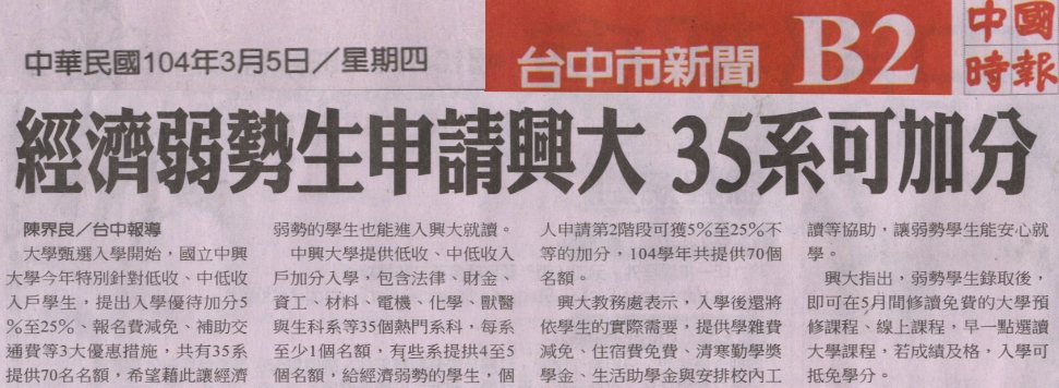 【媒體報導】經濟弱勢生申請興大 35系可加分