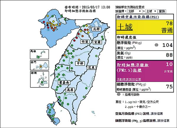 氣象局預報中心主任鄭明典昨天看到天空「霧茫茫」,逕自在個人臉書發文指出,「查看環保署資料,台北霧霧的感覺可能和二氧化硫濃度偏高有關。」(翻攝自鄭明典臉書) 環保署表示,昨天細懸浮微粒(PM2.5)濃度偏高,新北土城即時指標還紫爆了。(取自環保署網頁) |