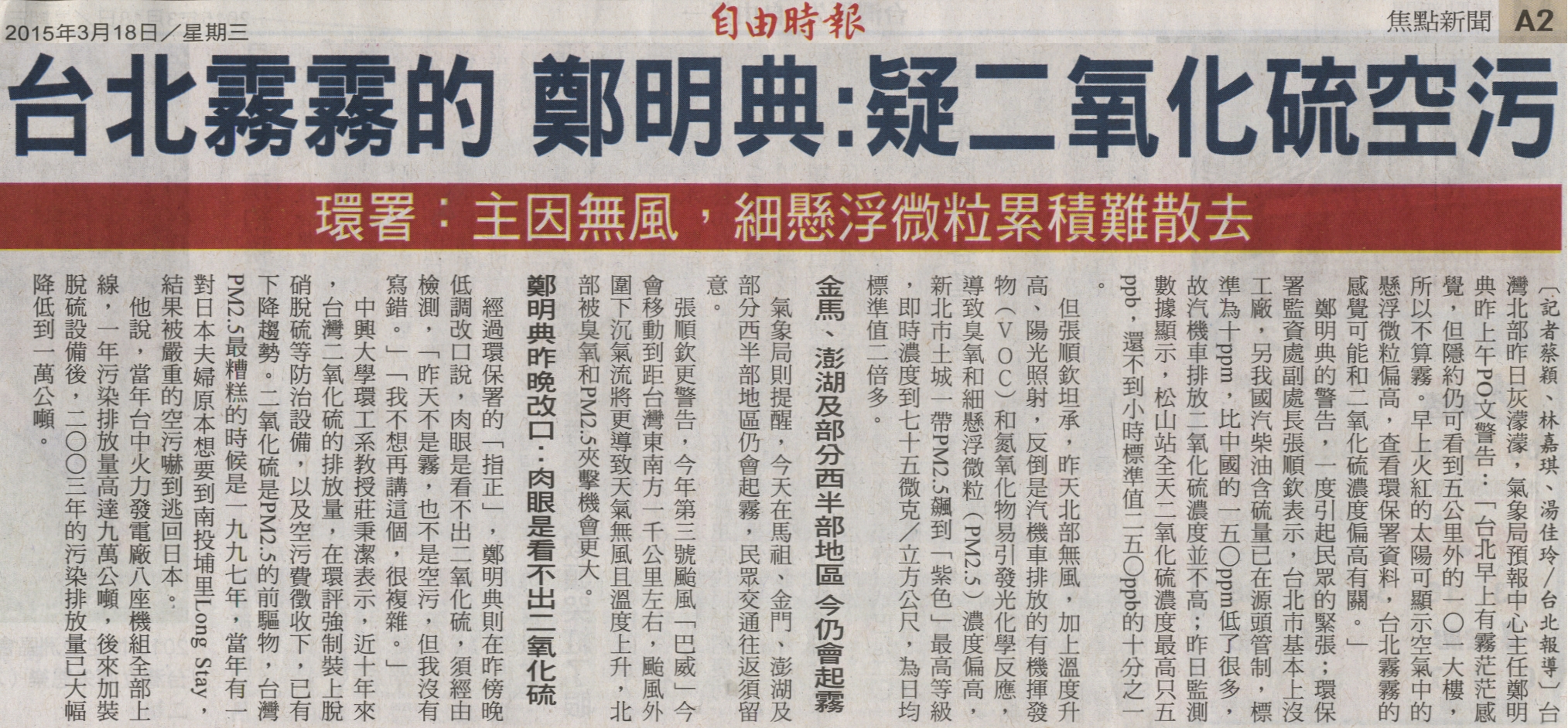 鄭明典的警告,一度引起民眾的緊張;環保署監資處副處長張順欽表示,台北市基本上沒工廠,另我國汽柴油含硫量已在源頭管制,標準為十ppm,比中國的一五○ppm低了很多,故汽機車排放二氧化硫濃度並不高;昨日監測數據顯示,松山站全天二氧化硫濃度最高只五ppb,還不到小時標準值二五○ppb的十分之一。