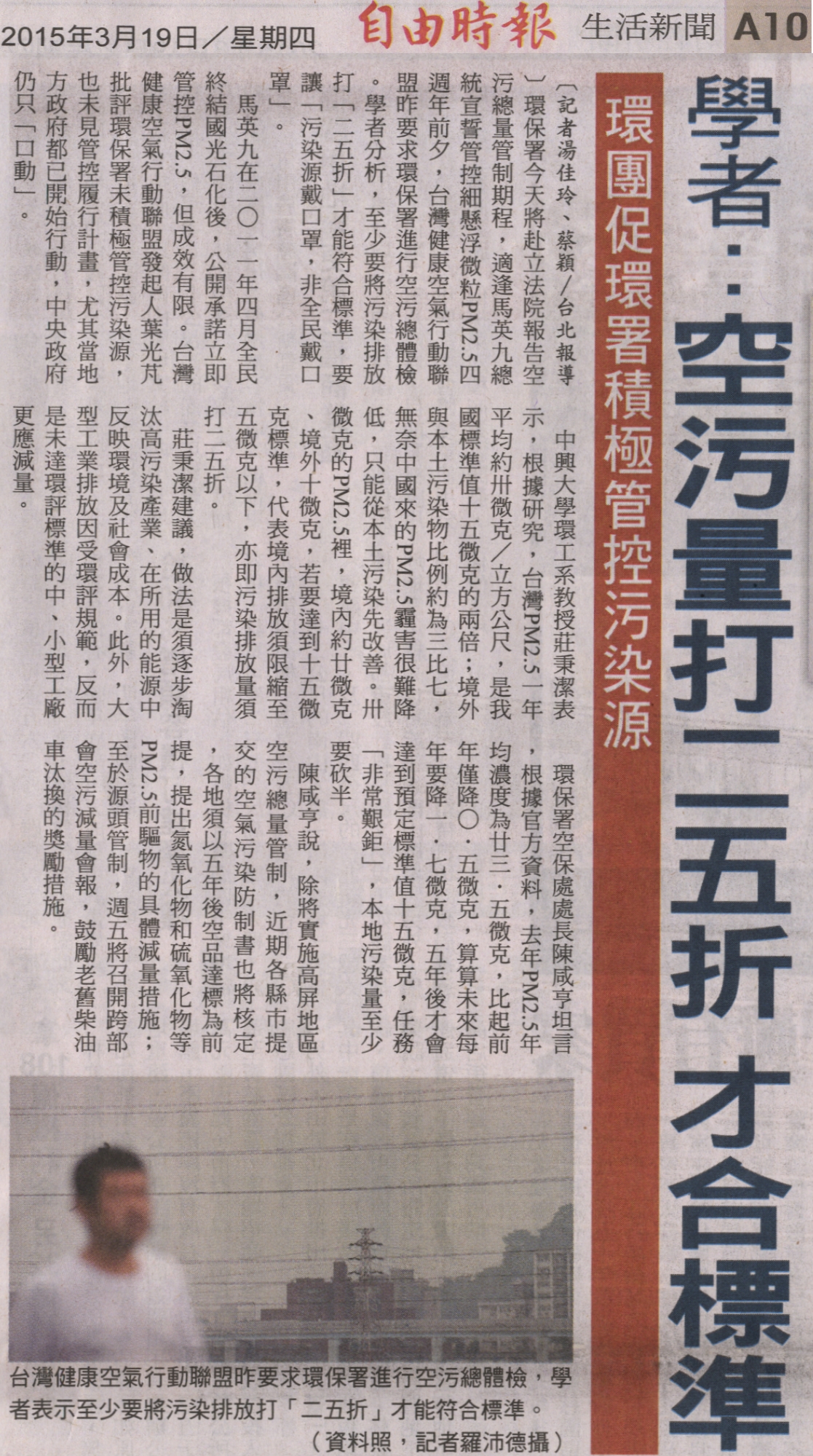 環保署今天將赴立法院報告空污總量管制期程,適逢馬英九總統宣誓管控細懸浮微粒PM2.5四週年前夕,台灣健康空氣行動聯盟昨要求環保署進行空污總體檢。學者分析,至少要將污染排放打「二五折」才能符合標準,要讓「污染源戴口罩,非全民戴口罩」。